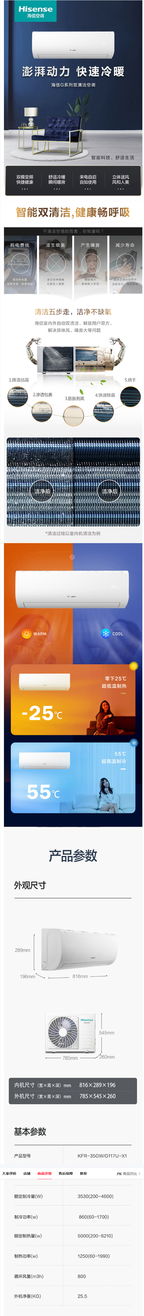 海信(Hisense) KFR-35GW/G117U-X1 816x289x196 澎湃动力 快速冷暖 本白色(单位:台)