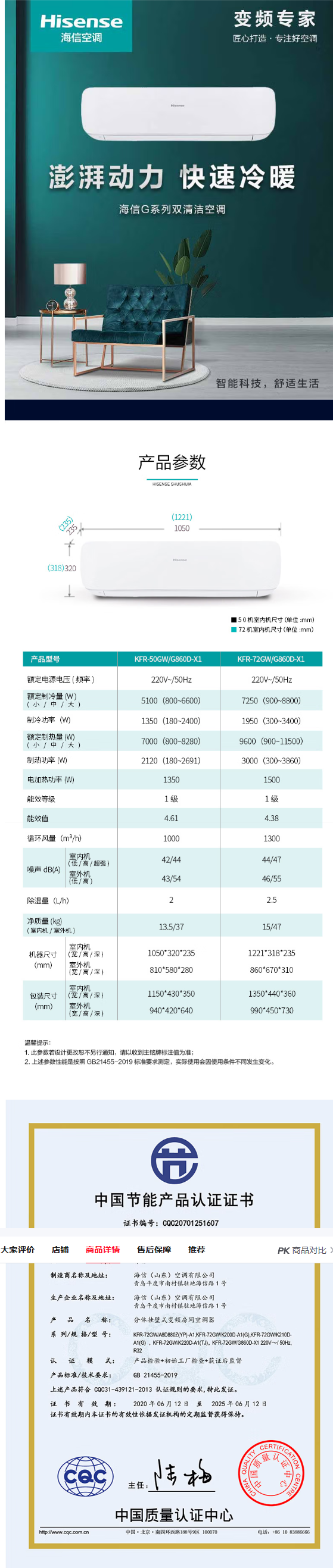 海信(Hisense) KFR-72GW/G860D-X1 1221*318*235 澎湃动力 快速冷暖 本白色(单位:台)