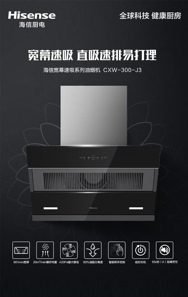 海信(Hisense) 吸油烟机大吸力侧吸式 智控家用 一级能效 CXW-300-J3 901*391*500mm 黑色(单位:台)