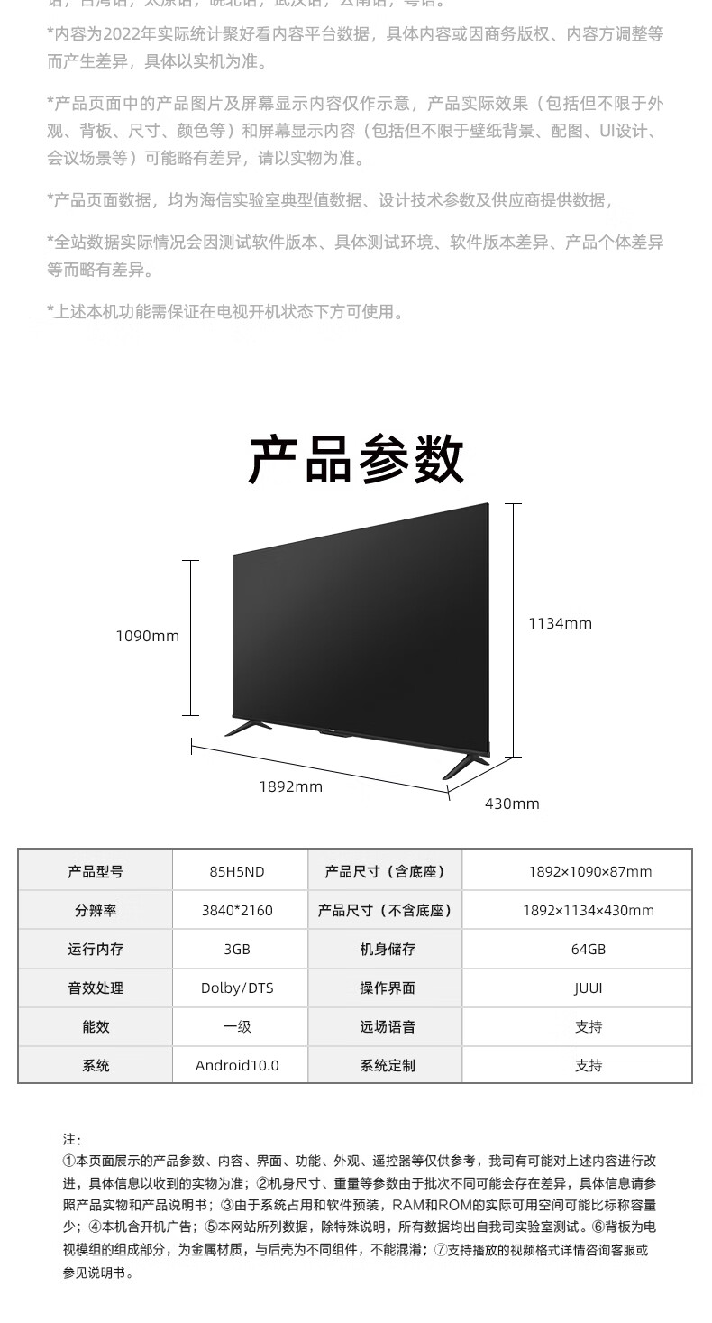海信(Hisense) 4K超高清 全面屏超薄液晶智能电视 85H5ND 85英寸 黑色(单位:台)