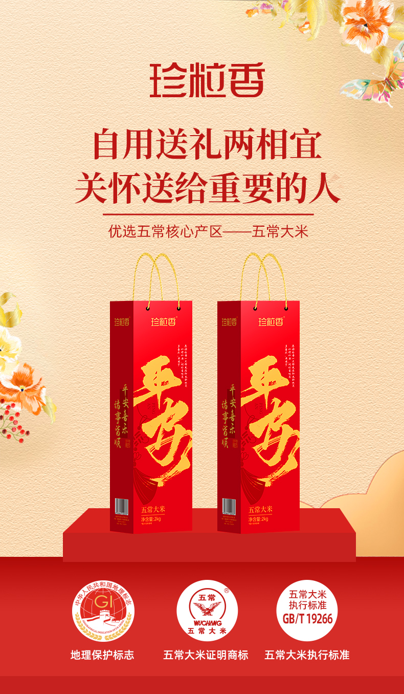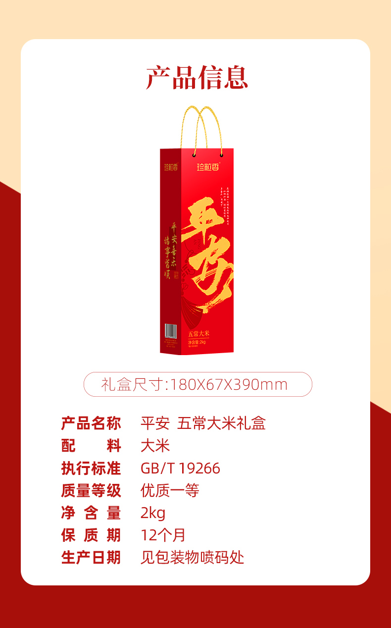 珍粒香 优选产区稻花香 平安五常大米礼盒 2kg 红色(单位:盒)