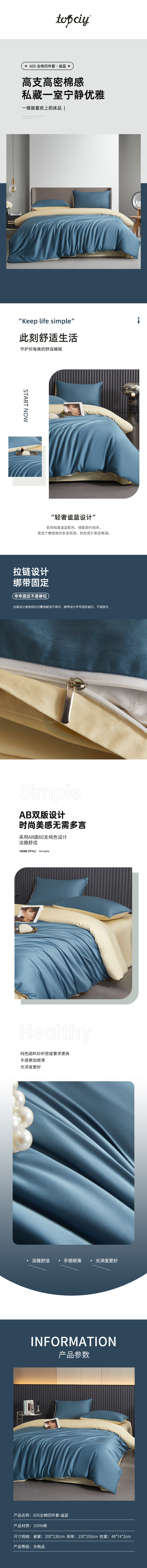 Topciy 60支长绒棉四件套-谧蓝 TX-TJ002 被套:200*230cm 深蓝色(单位:套)