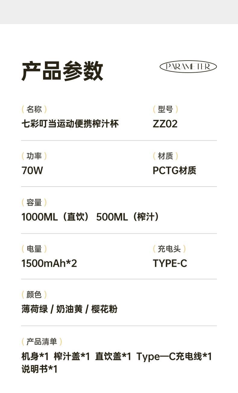 七彩叮当QC-ZZ02便携榨汁杯1L(单位:台) 粉色