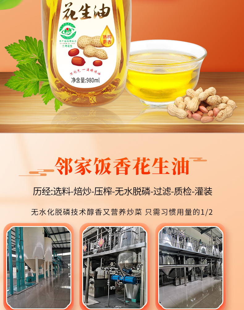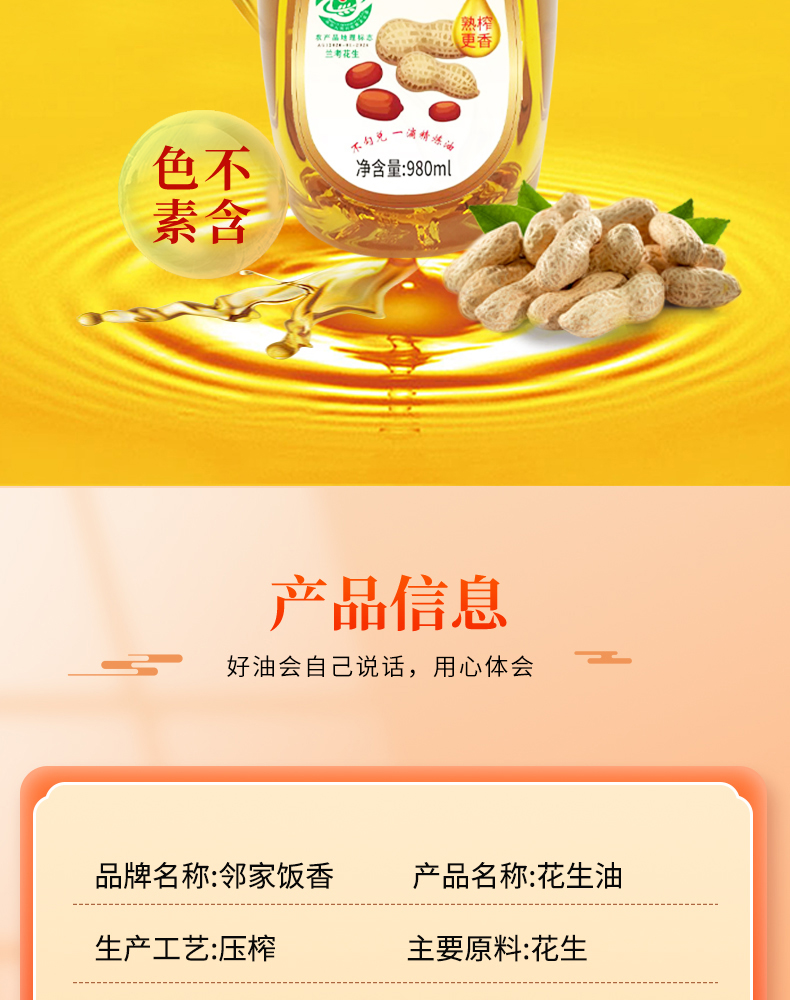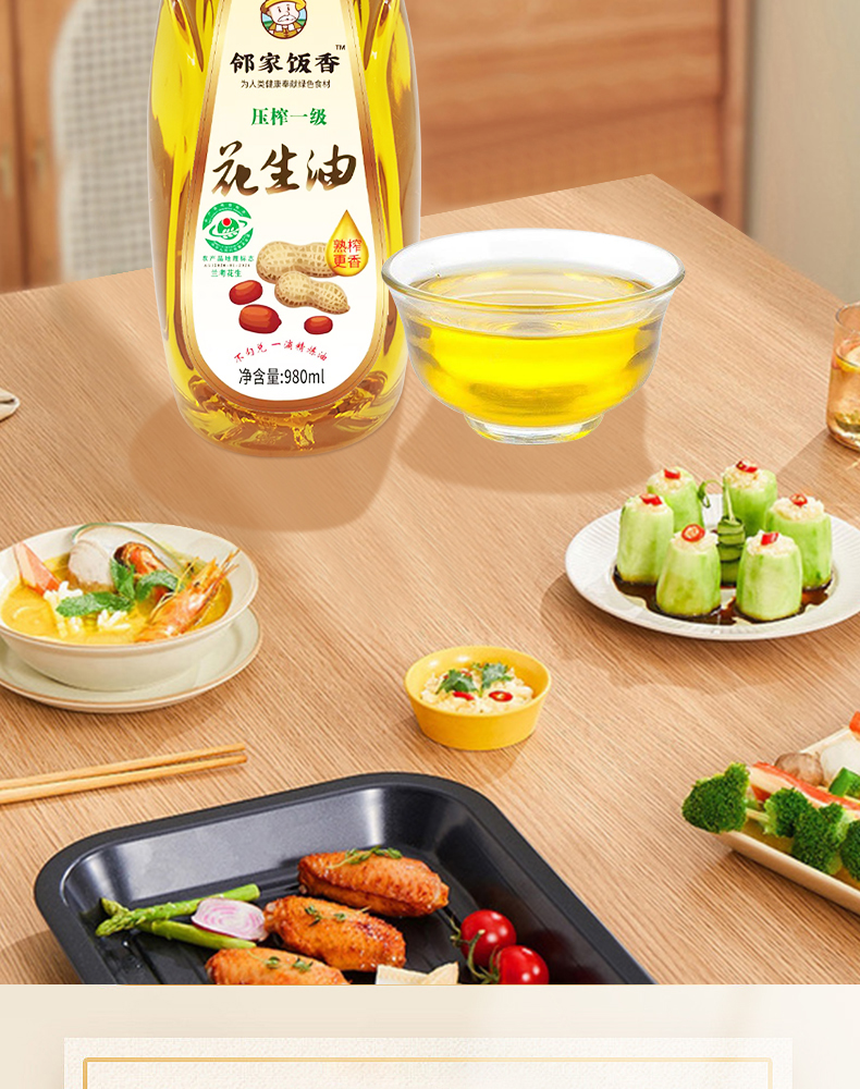 邻家饭香LJFX62 压榨一级花生油 980ml/瓶 玫瑰金