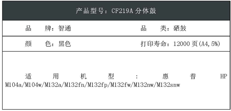 智通(ZT) ZT-CF219A-FD 标准版 打印量23000页 适用HP M104 MFP M132 硒鼓 1.00 只/支 (计价单位:支) 黑色