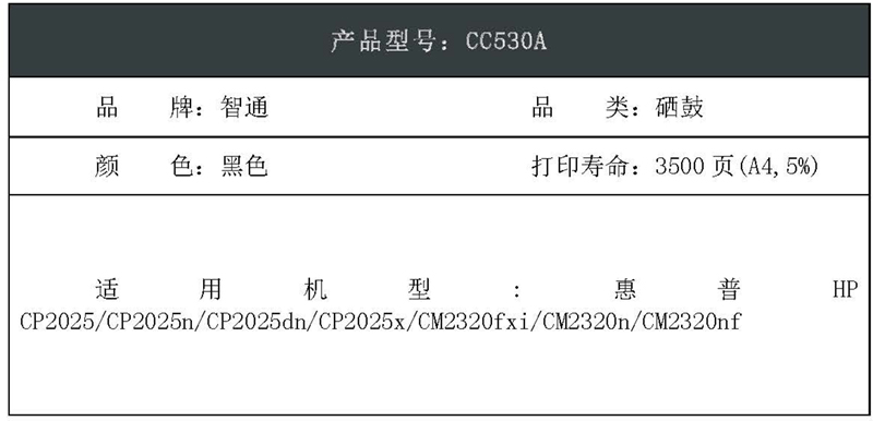 智通(ZT) ZT-CC530A-B 3500页 适用惠普HP CP2025/CP2025n/CP2025dn/CP2025x 硒鼓 1.00 只/支 (计价单位:支) 黑色
