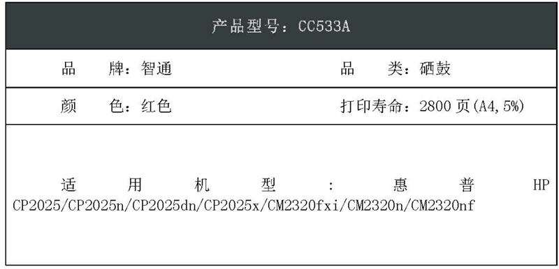 智通(ZT) ZT-CC533A-M 2800页 适用惠普HP CP2025/CP2025n/CP2025dn/CP2025x 硒鼓 1.00 只/支 (计价单位:支) 红色