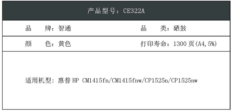 智通(ZT) CE322A 1300页 适用惠普HP CM1415fn CM1415fnw CP1525n CP1525nw 硒鼓 1.00 只/支 (计价单位:支) 黄色