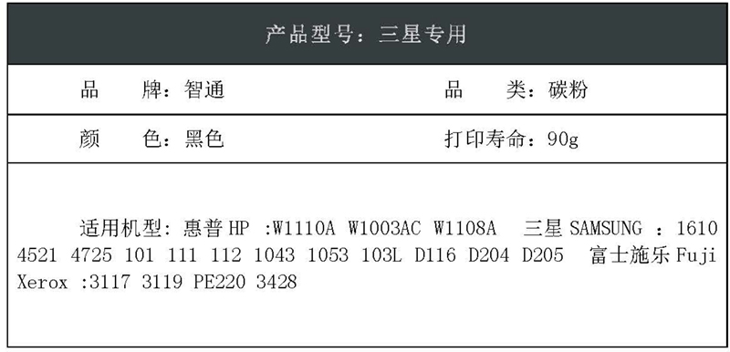 智通(ZT)三星专用 碳粉 黑色 90g 适用惠普:W1110A W1003AC 三星:1610 4521 4725 101 111 112 富士施乐:3117 3119 PE220 3428 黑色
