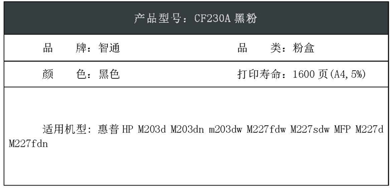 智通(ZT) ZT-CF230A-F PLUS版 打印量1600页 适用HP M203d 粉盒 1.00 只/支 (计价单位:支) 黑色