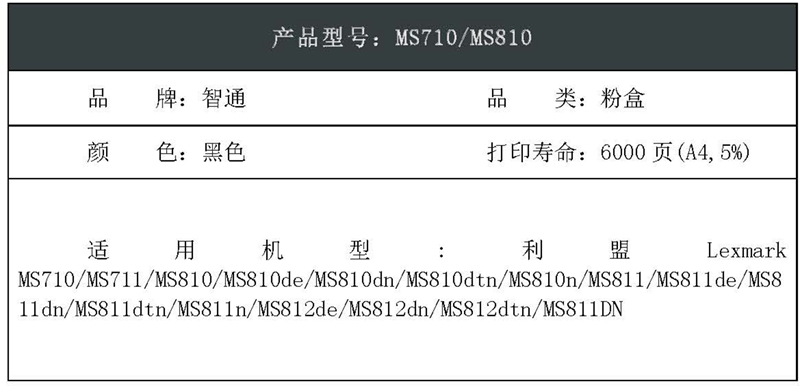 智通(ZT) MS710/MS810 PLUS版 6000页 适用利盟Lexmark MS710 MS711 MS810 MS810de MS810dn 粉盒 1.00 只/个 (计价单位:个) 黑色