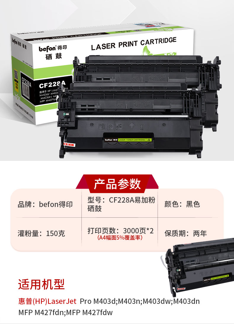 得印CF228A硒鼓 28a易加粉2支装适用惠普m403d m427dw m427fdw m403dn M403dw打印机粉盒墨盒带芯片 黑色
