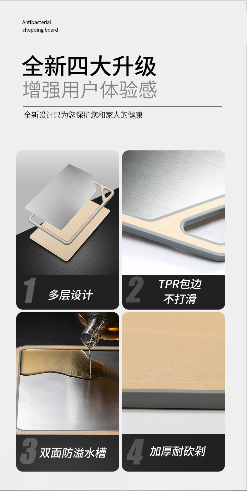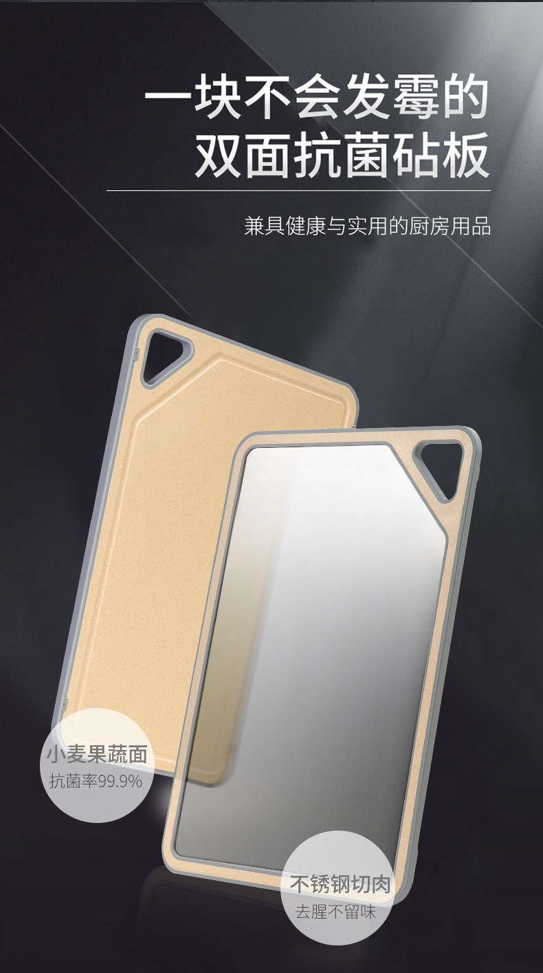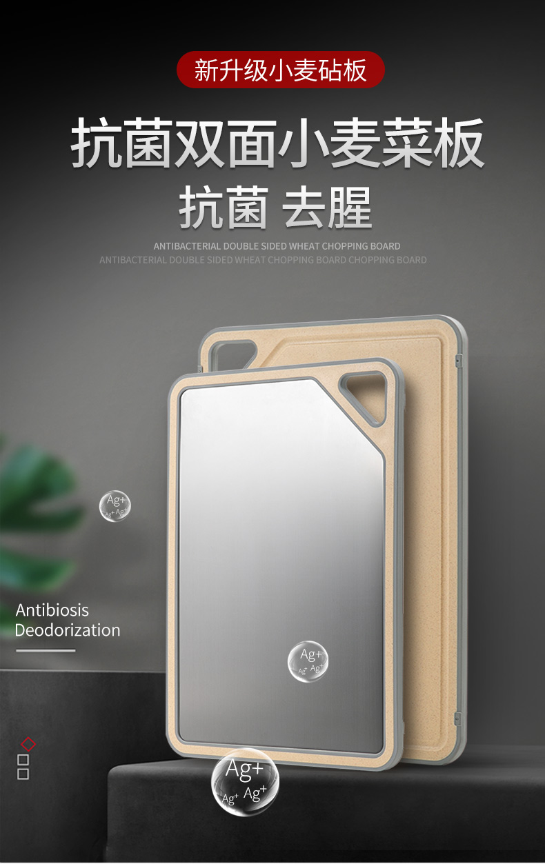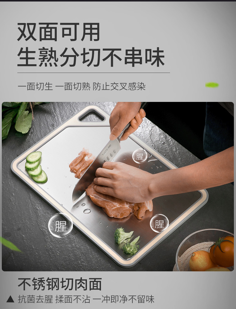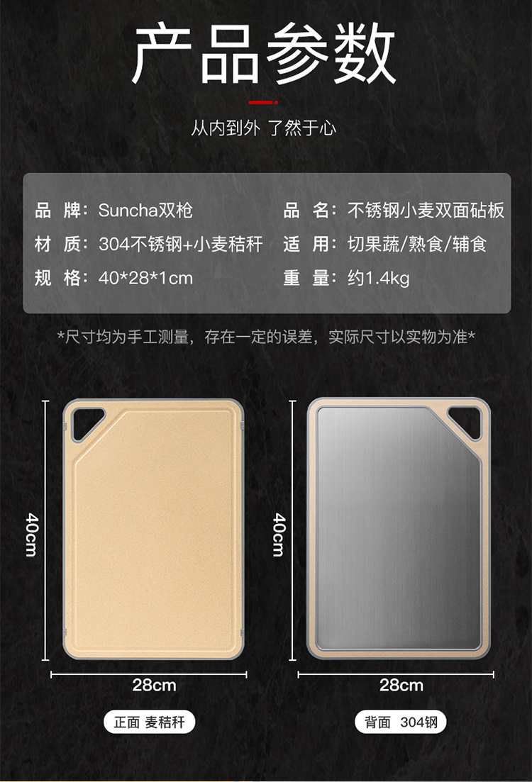双枪(Suncha)银离子抗菌小麦菜板 304不锈钢菜板 双面砧板 面板粘板 防滑硅胶包边 【中号】40*28*1cm 银色
