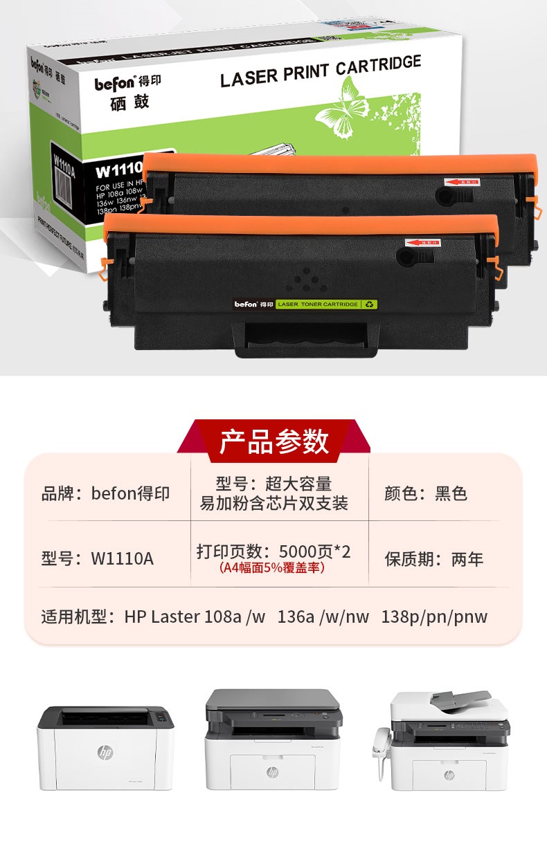 得印 W1110A硒鼓 110A 易加粉超大容量带芯片双支装 适用惠普HP136w墨粉盒 136a 136wm 136nw 108w/a 138pnw 黑色