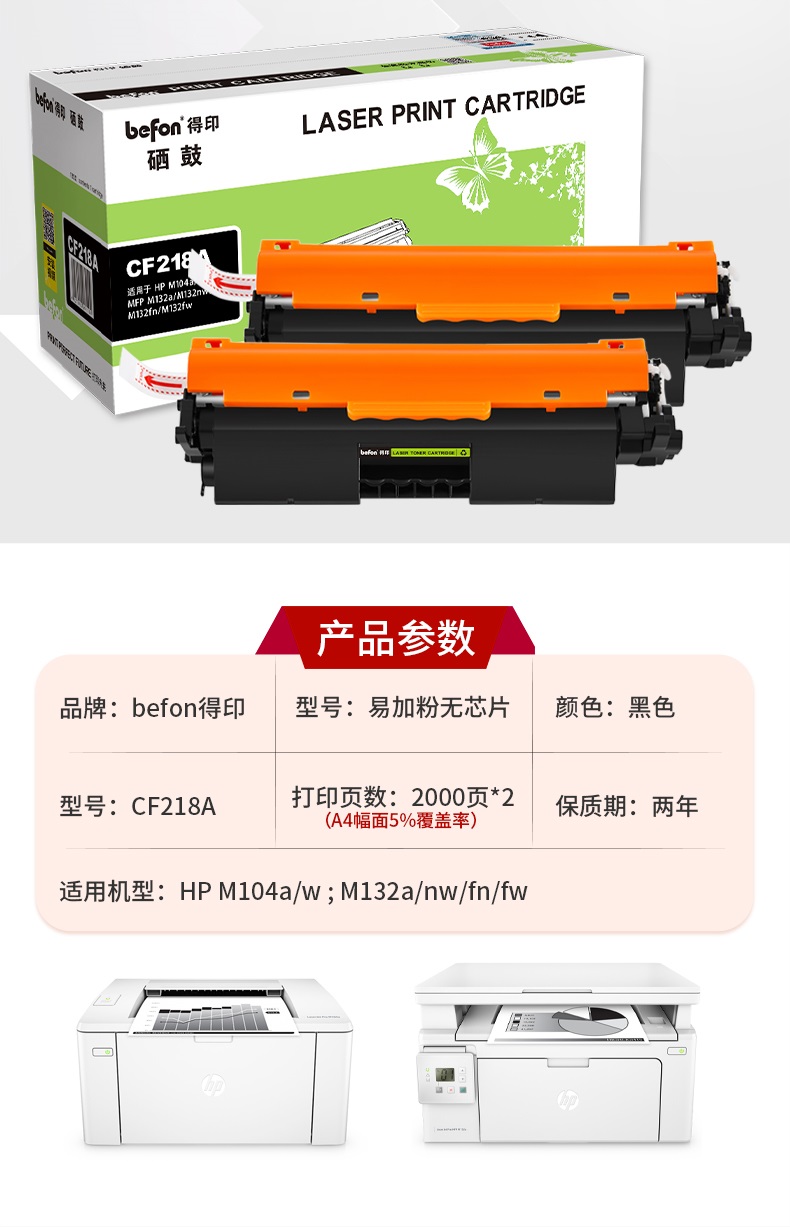 得印 CF218A硒鼓2支装 适用惠普m132nw m132a m104w m132fn 单位:套 黑色