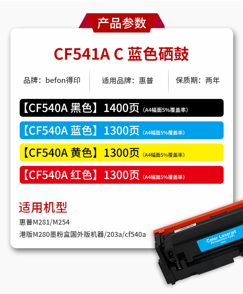 得印(befon)CF541A C 蓝色硒鼓 HP203A(适用惠普M281/M254/港版M280墨粉盒国外版机器/203a/cf540a) 蓝色