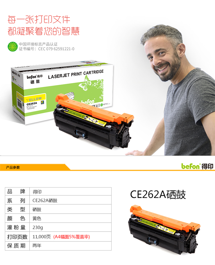 得印(befon) CE262A 硒鼓 大容量 11000页 适用惠普 CP4025 单位:支 黄色