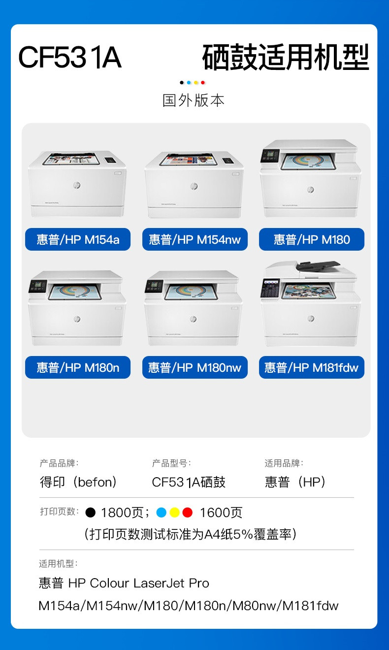 得印CF531A硒鼓 适用惠普HP M154a/M154nw/M180N/M181FW 单位:支 蓝色
