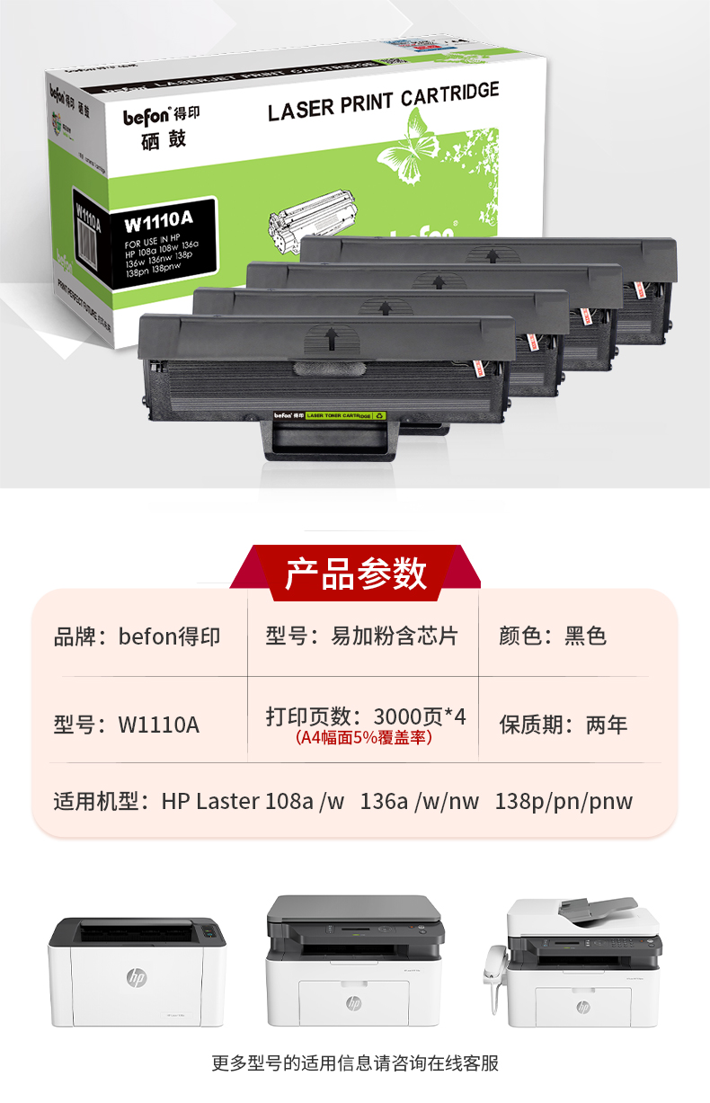 得印 W1110A硒鼓大容4支装 适用惠普HP 136w136a 136wm 136nw单位:套 黑色