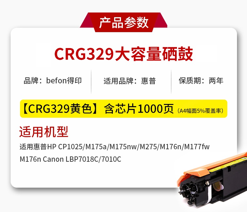 得印(befon) CRG329 硒鼓 带芯片1000页 适用惠普M176n 130A 单位:支 黄色