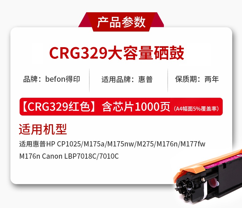 得印(befon) CRG329 硒鼓带芯片 1000页 适用惠普M176n 130A 单位:支 红色