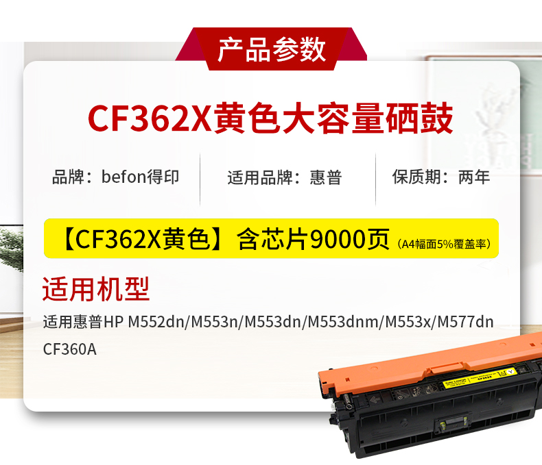 得印CF362X硒鼓黄色大容量 508A 适用惠普HP M552dn M553n M553dn 支 黄色