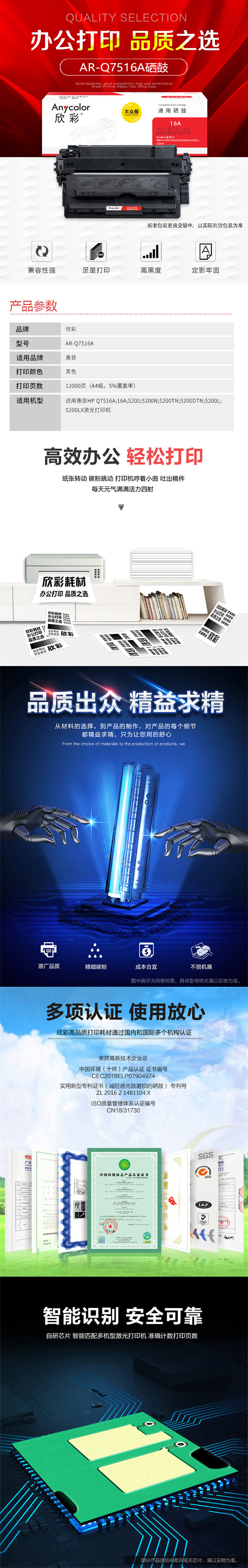 欣彩(Anycolor) AR-Q7516A 专业版 12000页 适用惠普HP 5200 硒鼓 1.00 只/支 (计价单位:支) 黑色