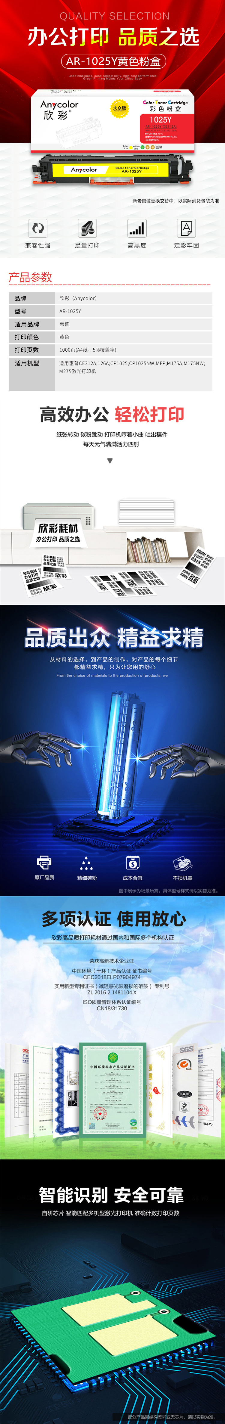 欣彩(Anycolor) AR-1025Y 1000页 适用惠普HP CP10251025NW 粉盒 1.00 只/支 (计价单位:支) 黄色