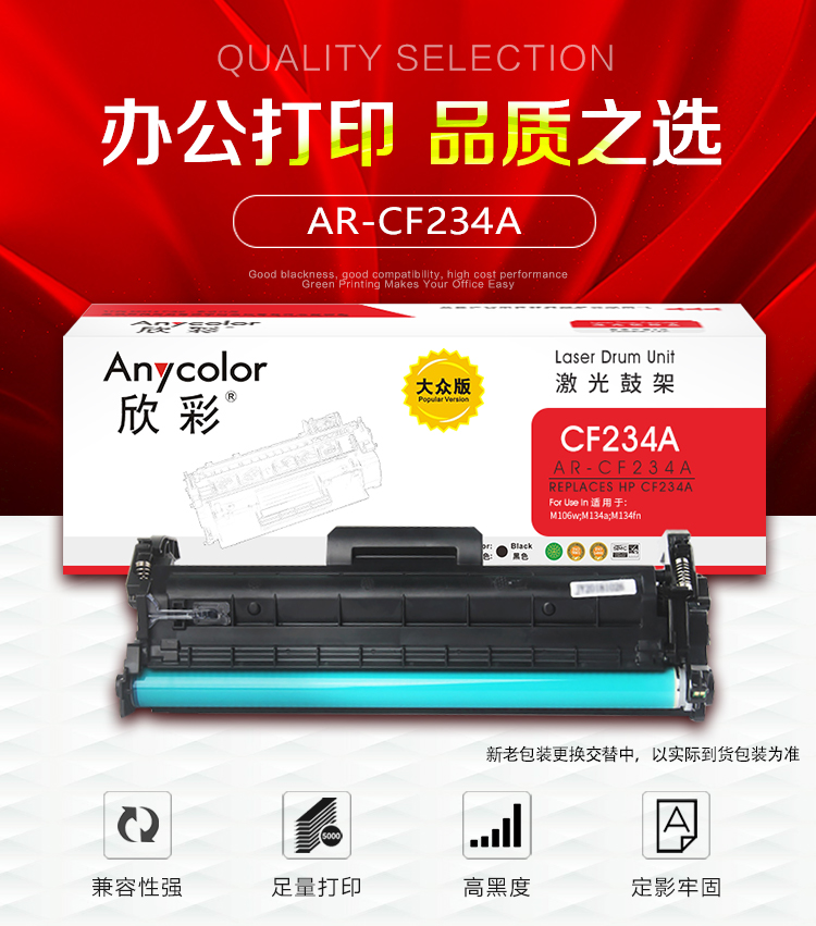 欣彩 CF234A鼓架 大众版 AR-CF234A硒鼓 hp34A带芯片 适用惠普HP M106w M134a M134fn 黑色