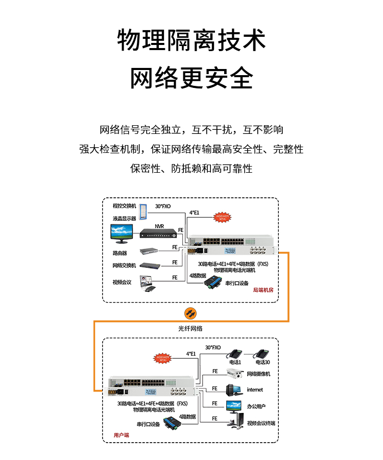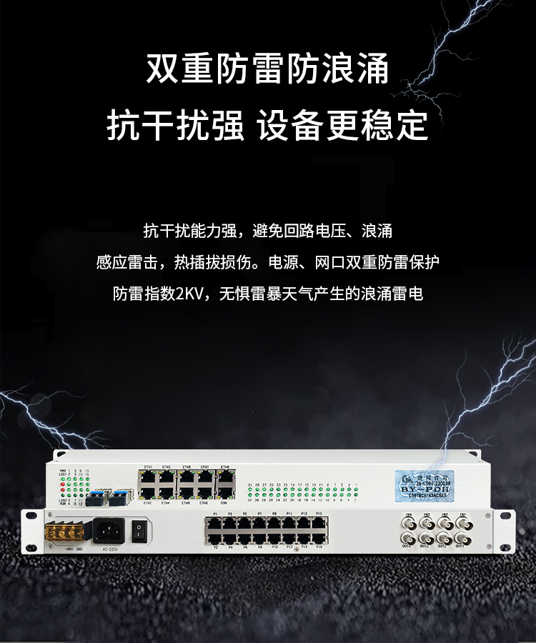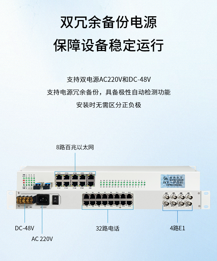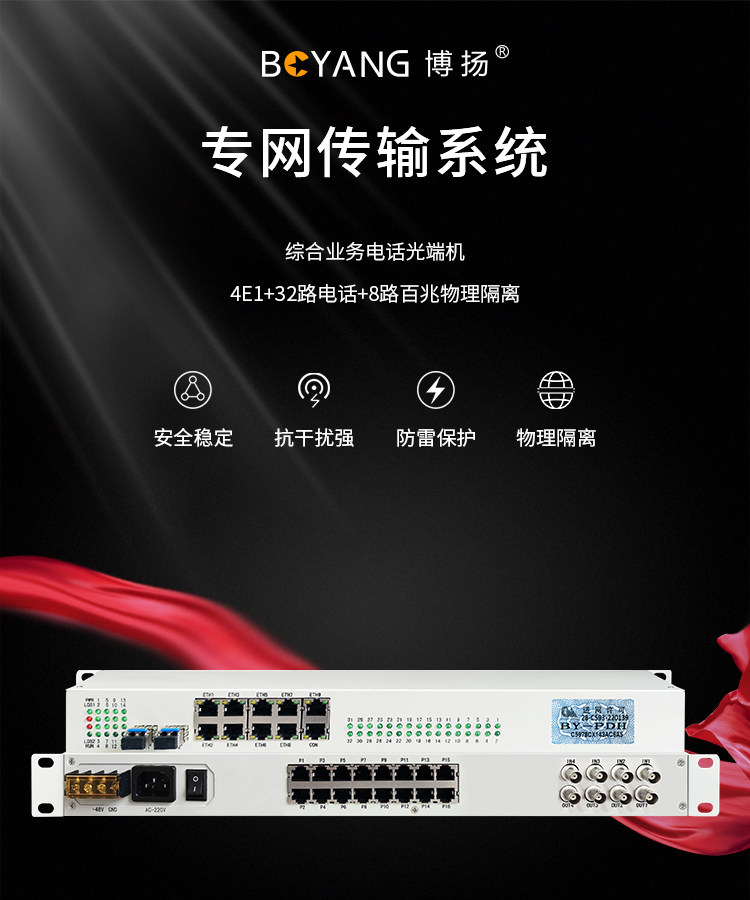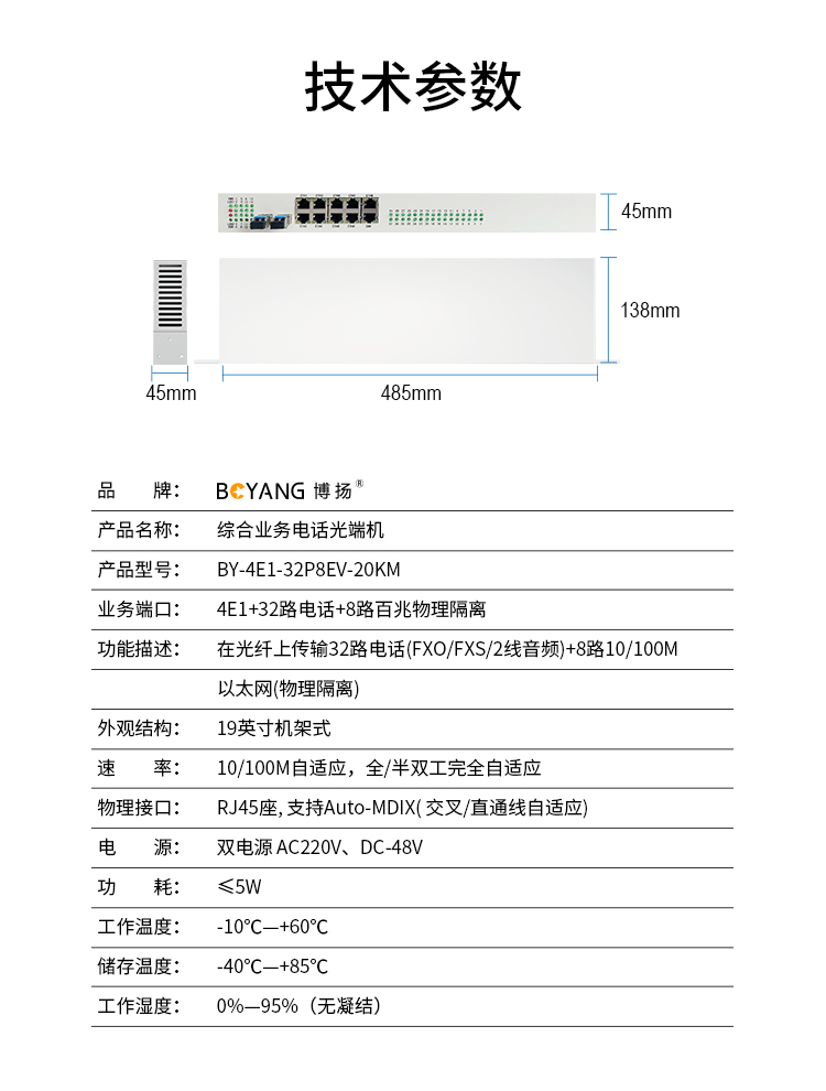 博扬 综合业务光端机 4E1+32路电话+8路物理隔离百兆 单纤20KM SFP(LC) 双电源 白色