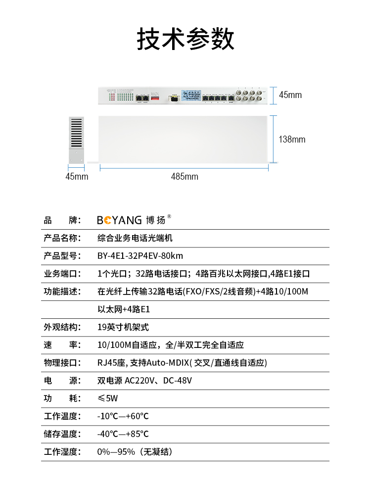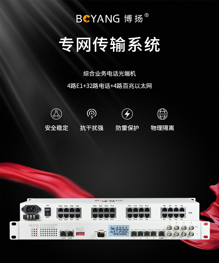 博扬 综合业务电话光端机 4路E1+32路电话+4路百兆物理隔离以太网 单纤80km 机架式 1对 白色