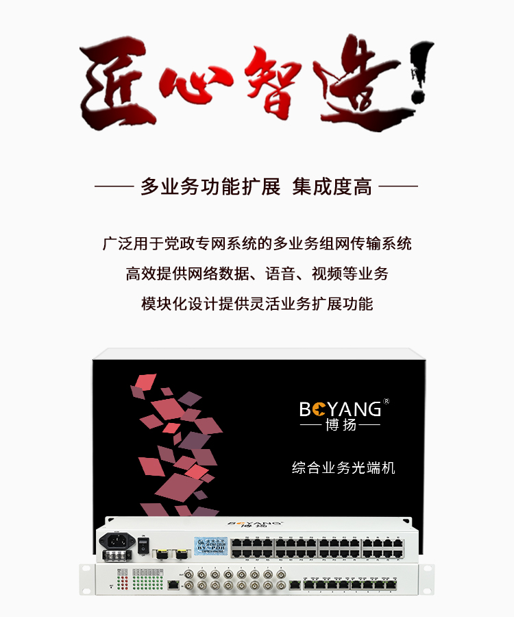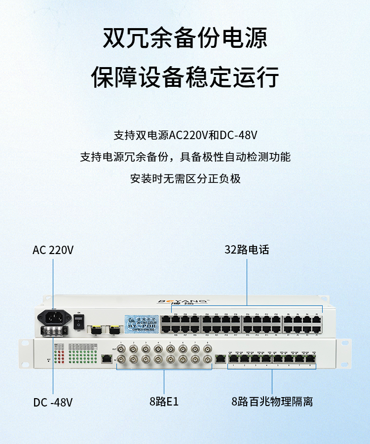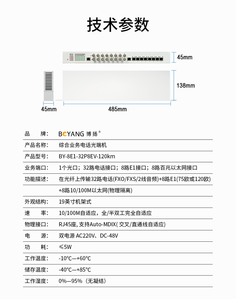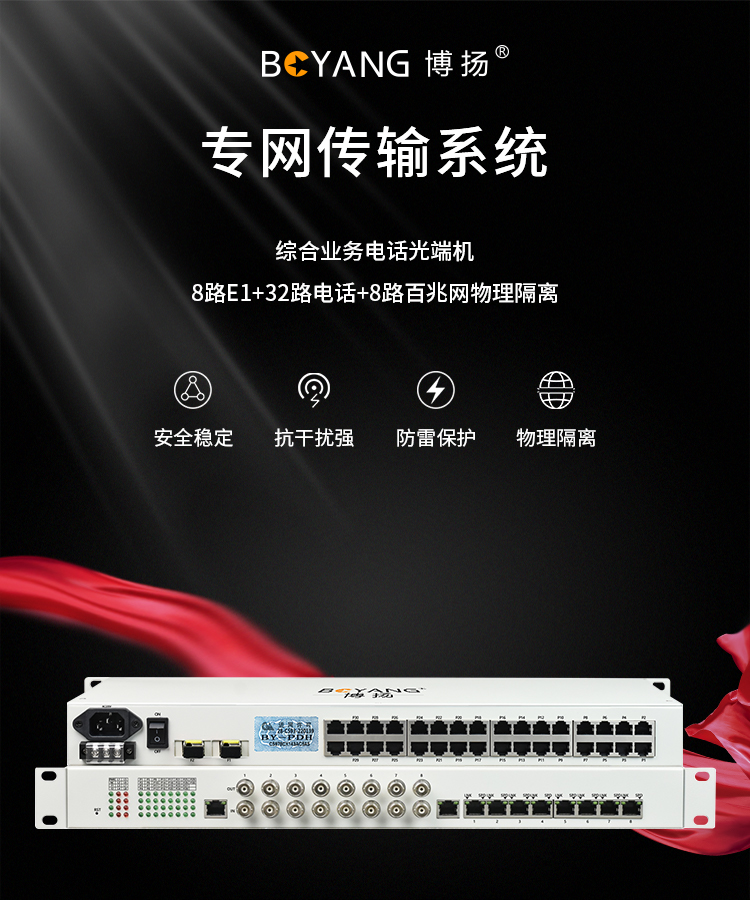 博扬 综合业务电话光端机 8路E1+32路电话+8路百兆网物理隔离 单纤120km 机架式 1对价 白色