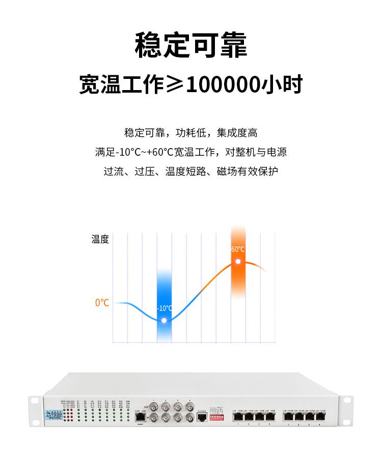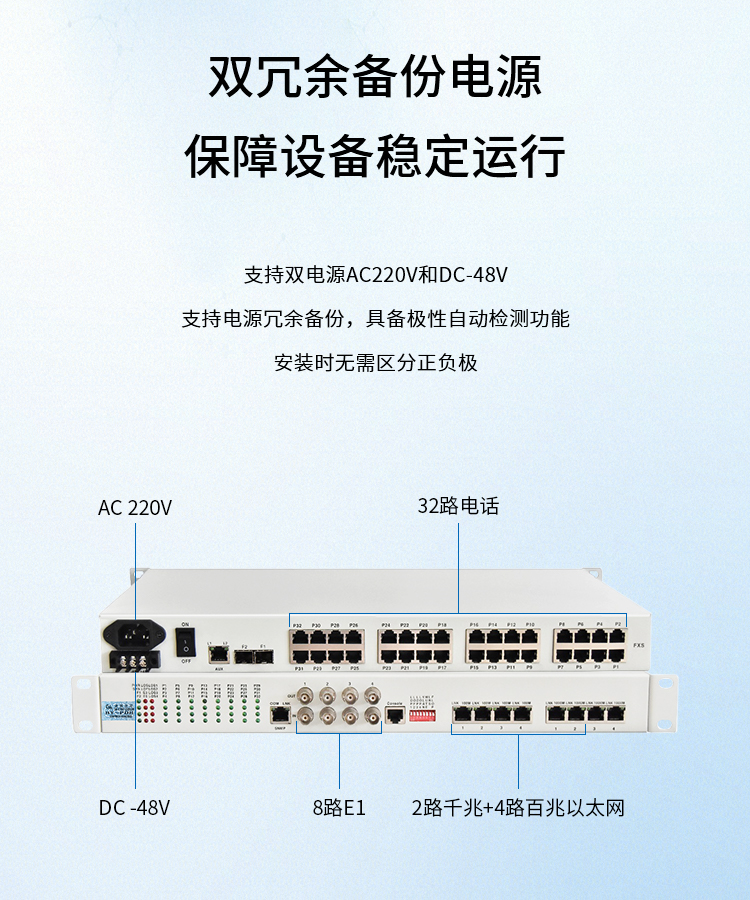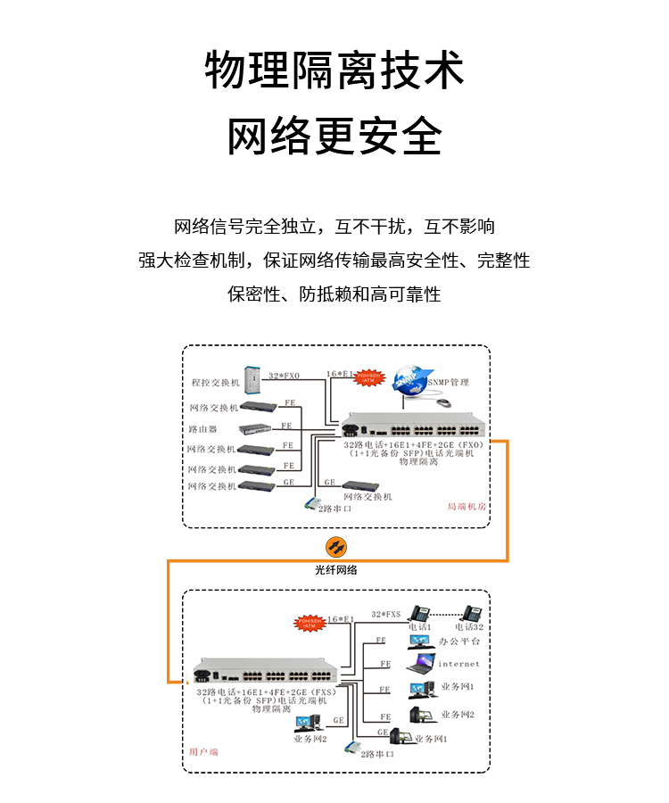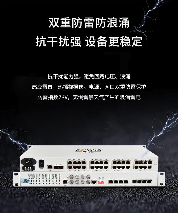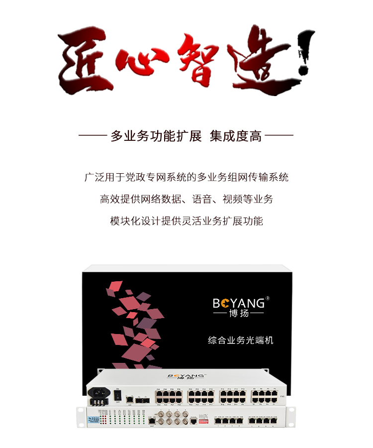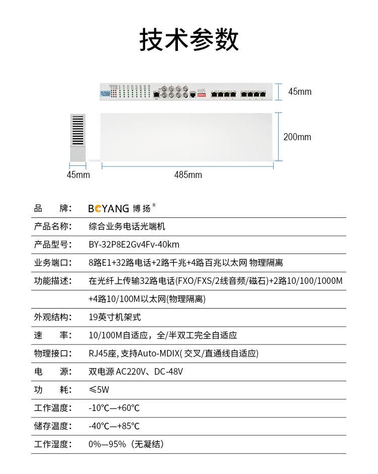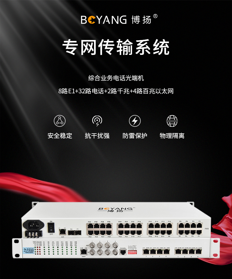 博扬 综合业务光端机 8E1+32电话+2路千兆+4百兆以太网物理隔离 LC单纤40km 机架式1对 白色