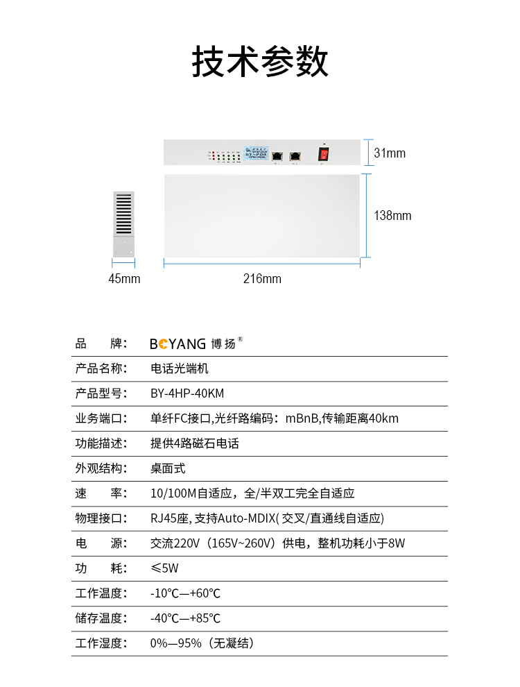 博扬 电话光端机 4路磁石电话光端机 单模单纤FC口 40KM 1对价 BY-4HP-40KM 白色