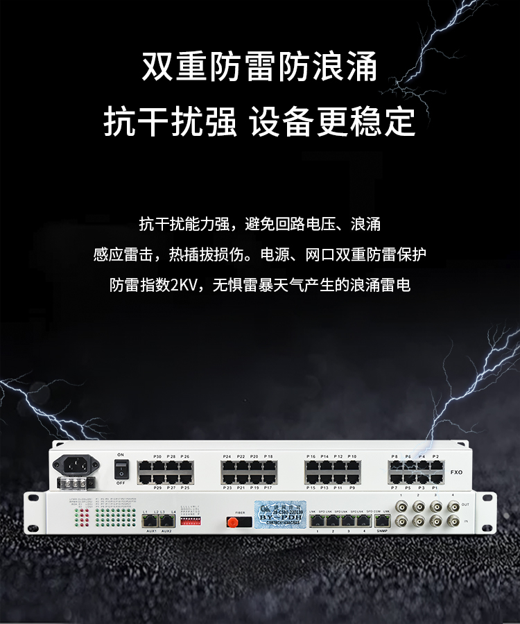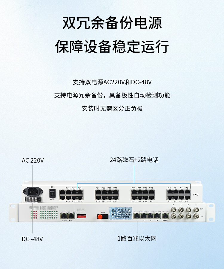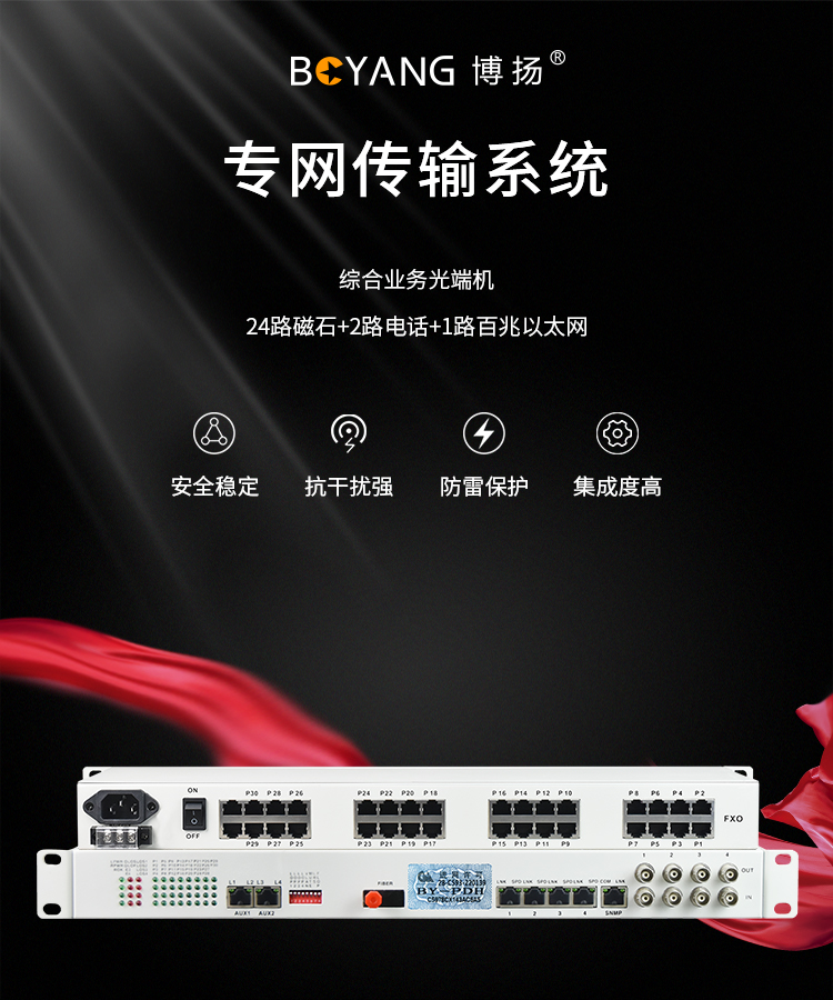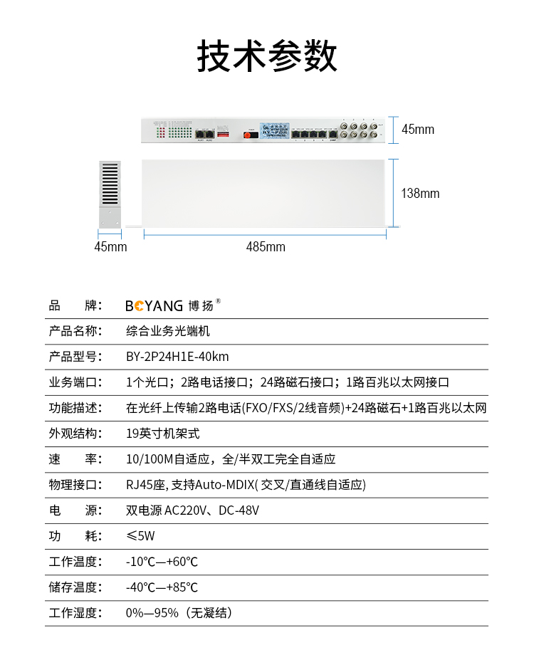 博扬 综合业务光端机 24路磁石+2路电话+1路百兆以太网 单模单纤40km 机架式冗余备份 1对价 白色