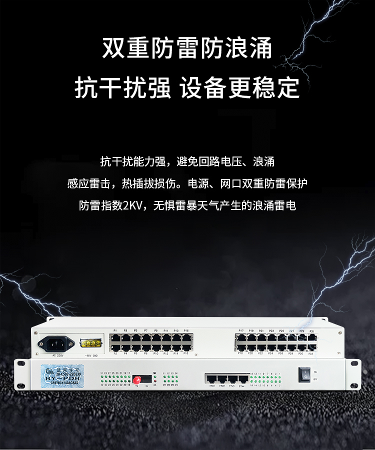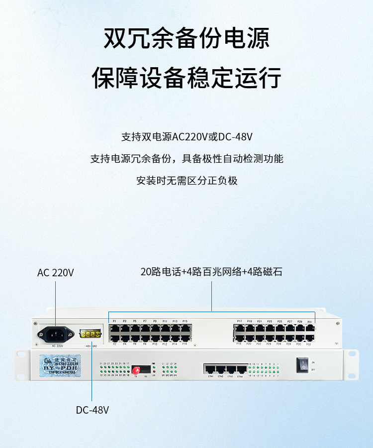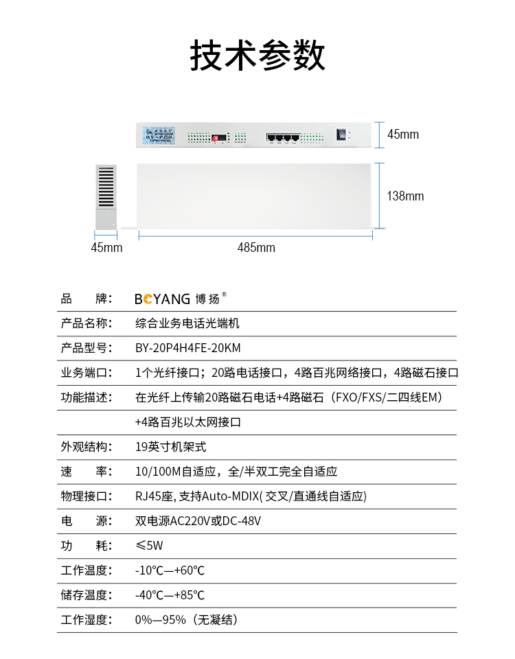 博扬 综合业务电话光端机 20路电话+4路百兆网络+4路磁石 单纤20km 机架式双电源 1对价 白色