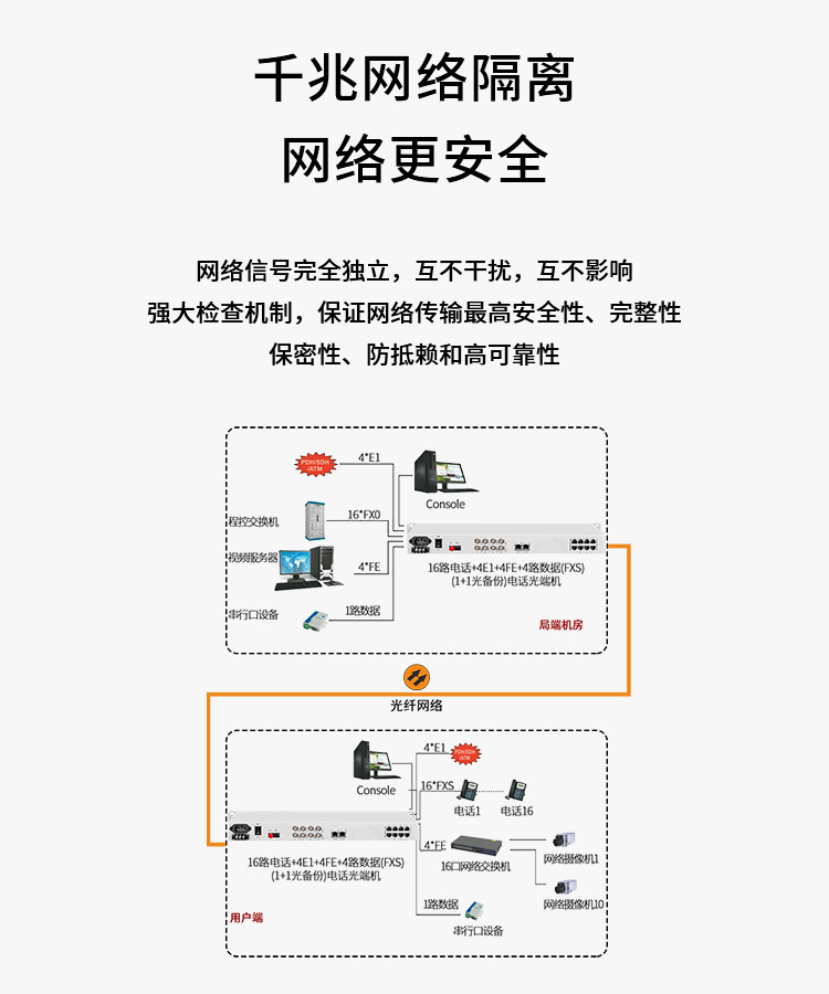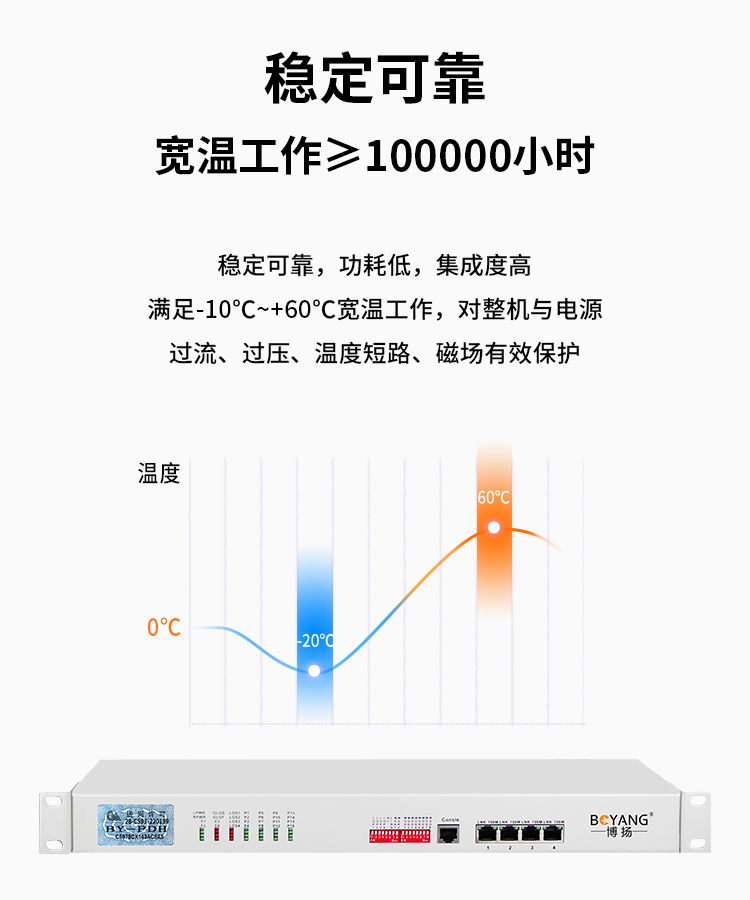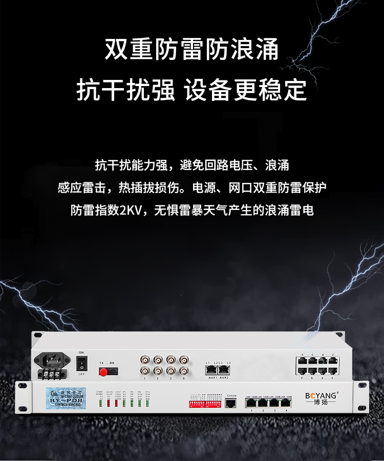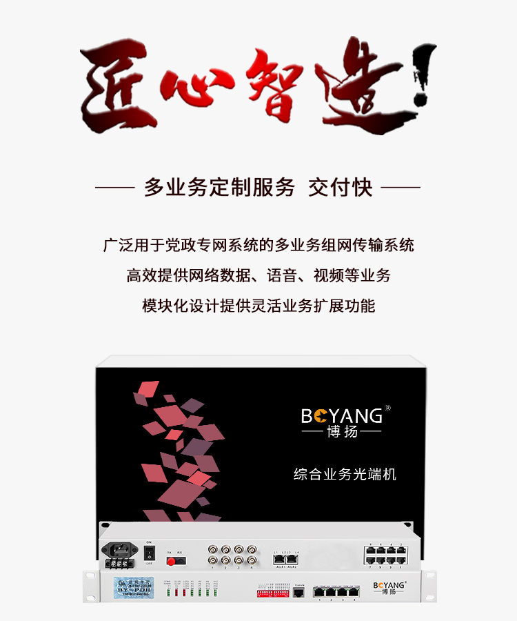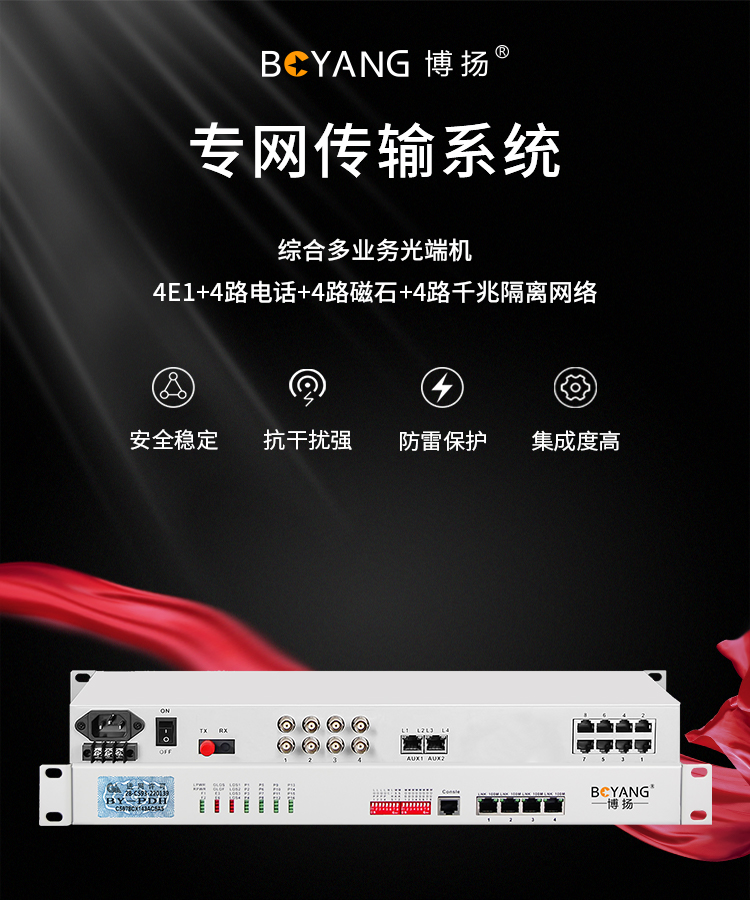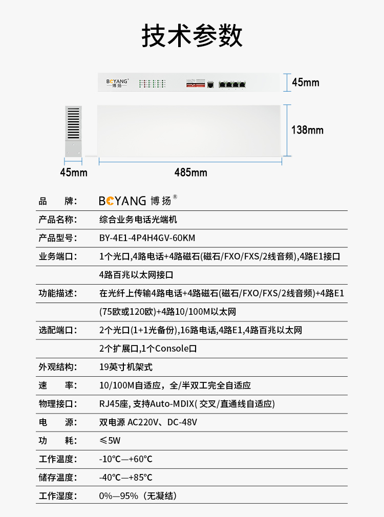 博扬 综合业务电话光端机 4E1+4路电话+4路磁石+4路千兆隔离网络 单纤FC 60km 机架式 白色