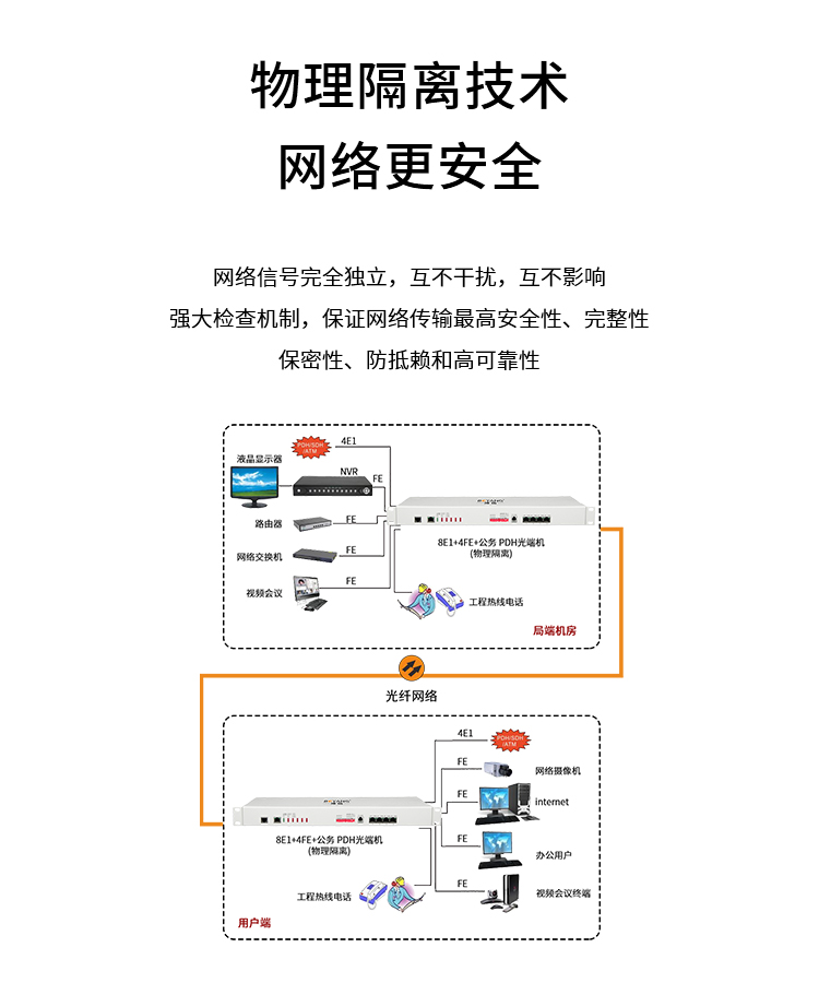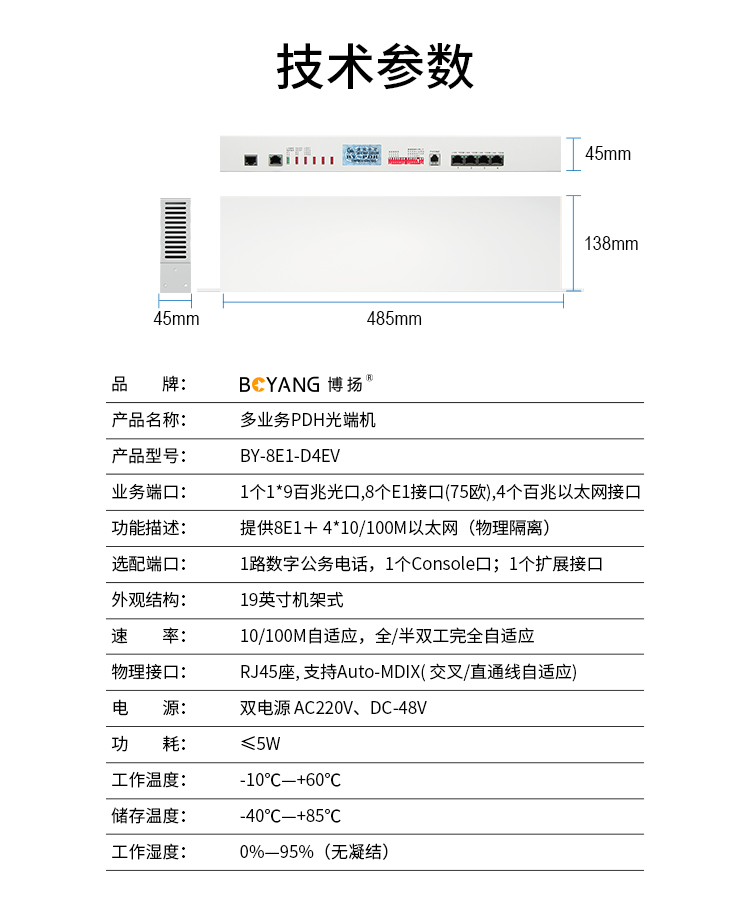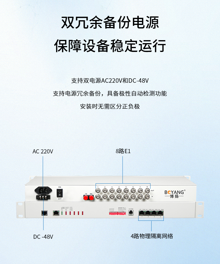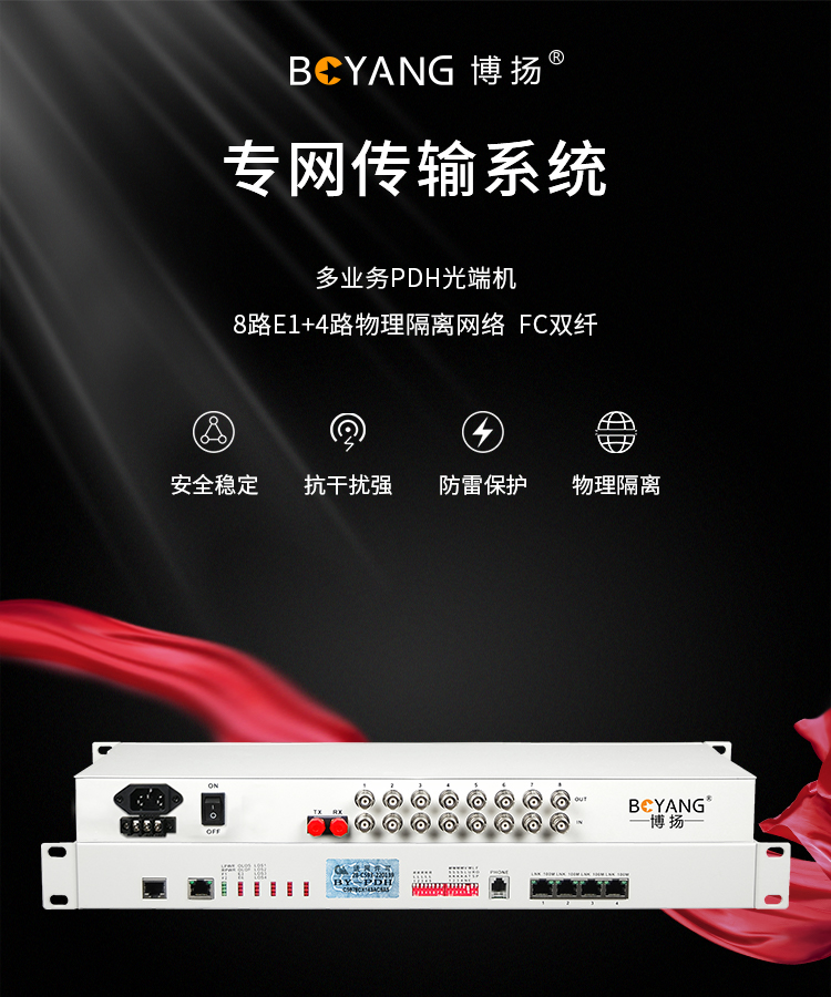 博扬 PDH光端机8E1 8路2M+4路以太网带物理隔离 FC双纤20公里 机架式 1对价 白色