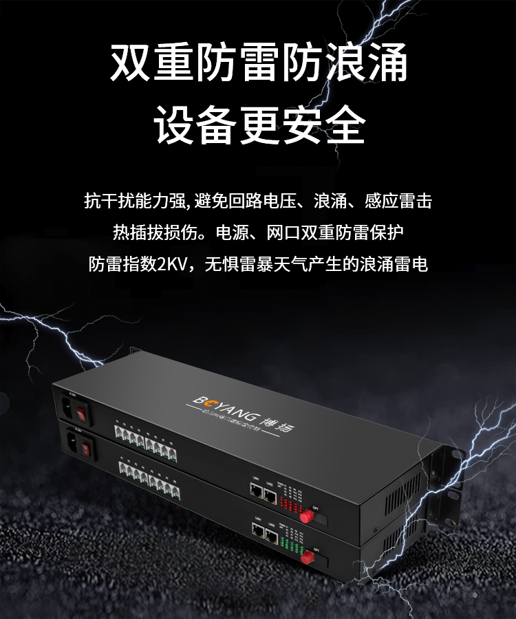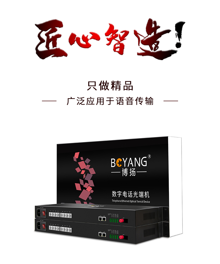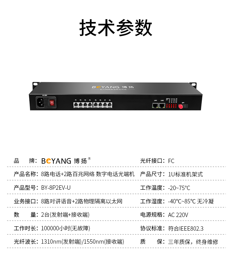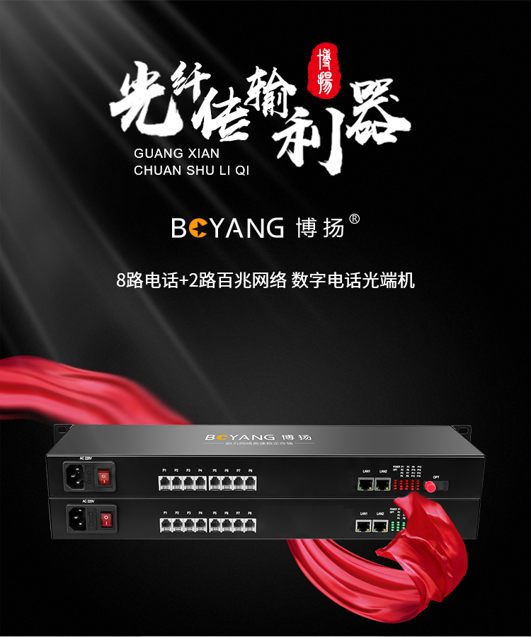 博扬 电话光端机 8电话+2路百兆网络 8路对讲语音+2路物理隔离以太网光纤传输 FC口机架式1对 黑色