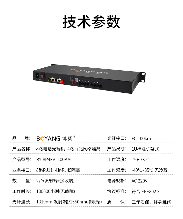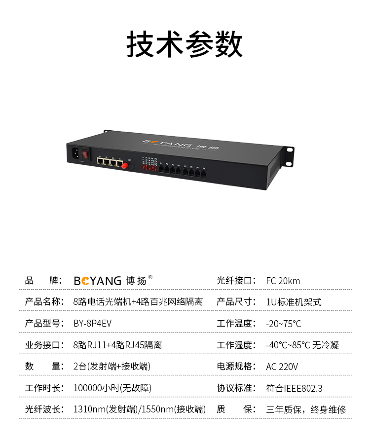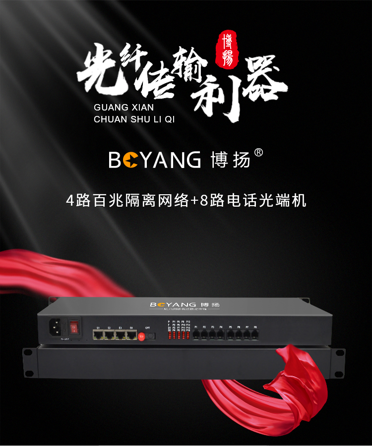 博扬(BOYANG)电话光端机8路电话+4路百兆网络 8路对讲语音+4路物理隔离以太网光纤传输 黑色