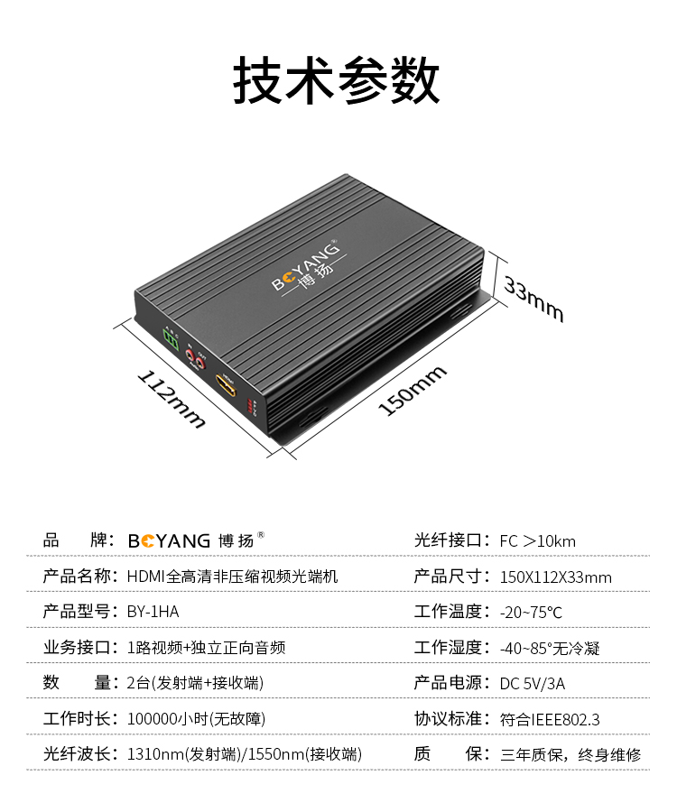 博扬(BOYANG)非压缩全高清HDMI视频光端机1路视频+独立正向音频 HDMI延长器收发器一对 黑色