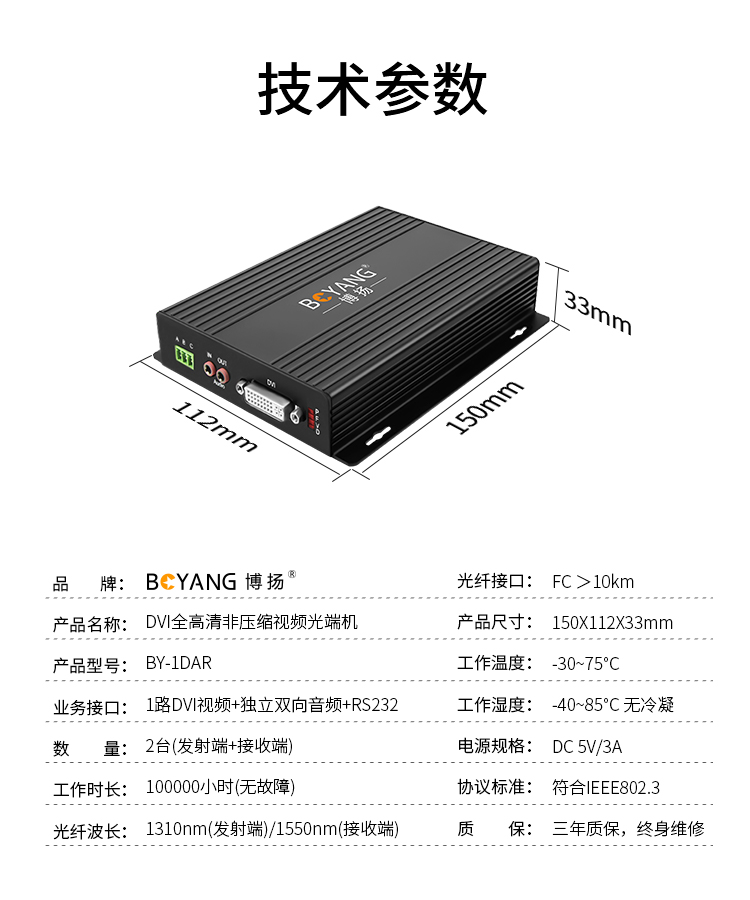 博扬(BOYANG) 非压缩全高清DVI视频光端机1路视频+独立双向音频+RS232 DVI延长器 黑色