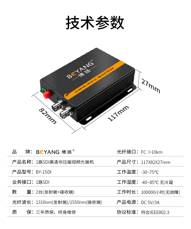 博扬 非压缩全高清HD-SDI视频光端机1路视频 光纤收发器转换器延长器一对 黑色