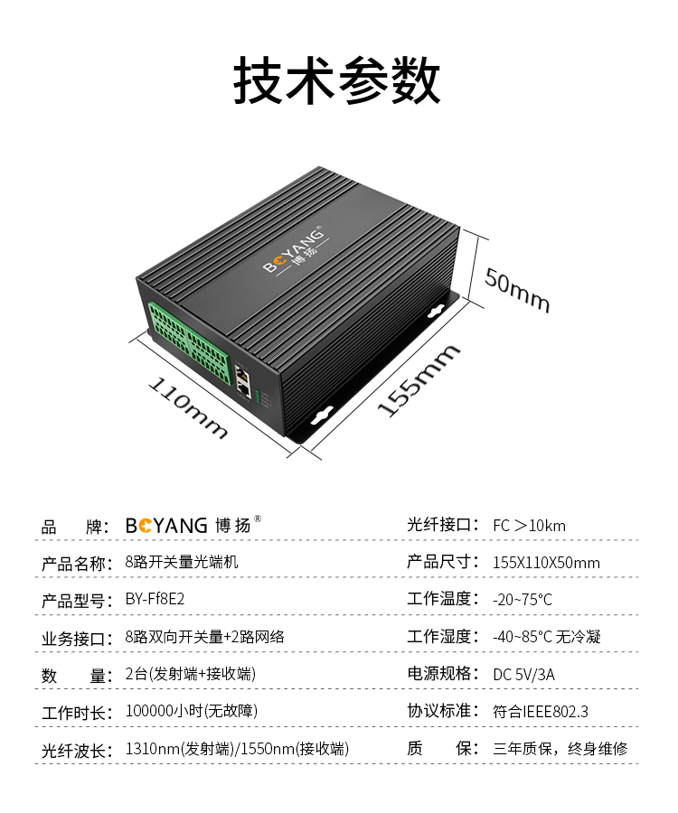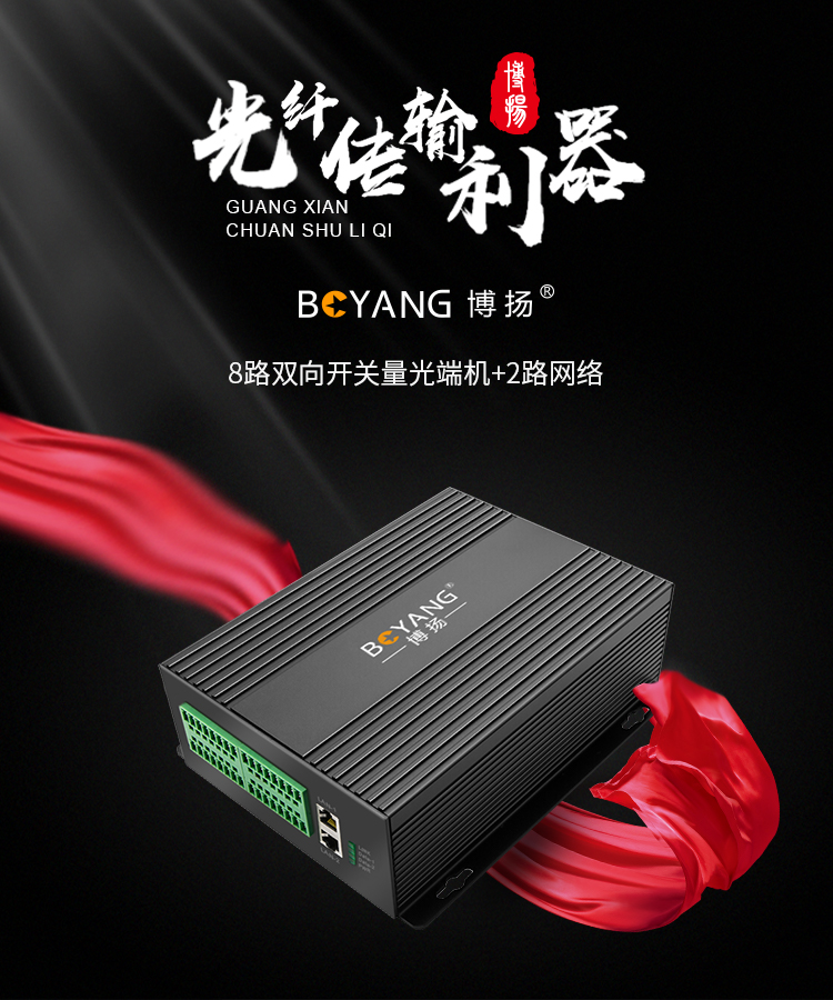 博扬 开关量光端机8路双向开关量+2路网络 转光纤红外对射/周界报警/烟感报警/信号报警 黑色