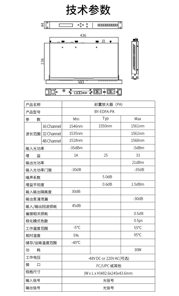 博扬 EDFA放大器 PA前置放大器 1550nm掺铒光纤放大器 C波段高平坦性 白色