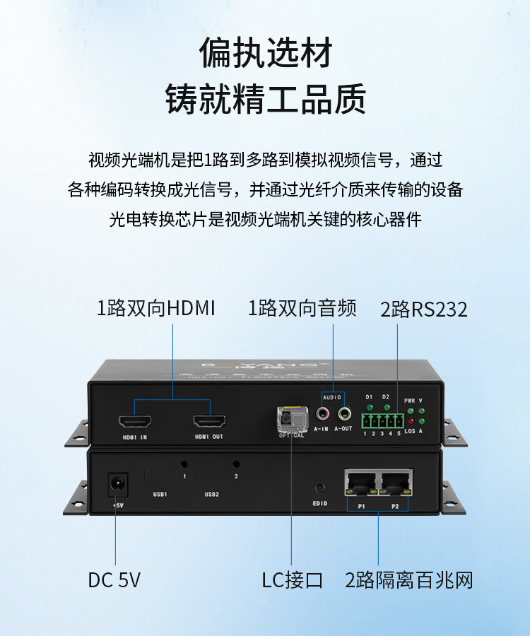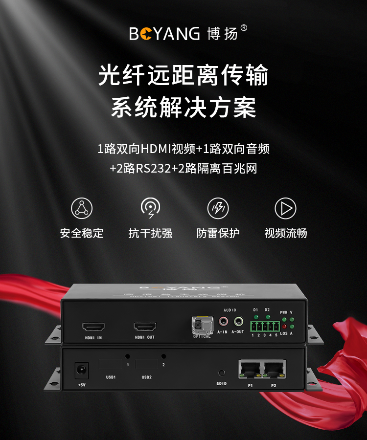 博扬 非压缩1路双向HDMI光端机 1路双向视频+1路双向音频2路隔离百兆网+2路232 LC桌面式 黑色