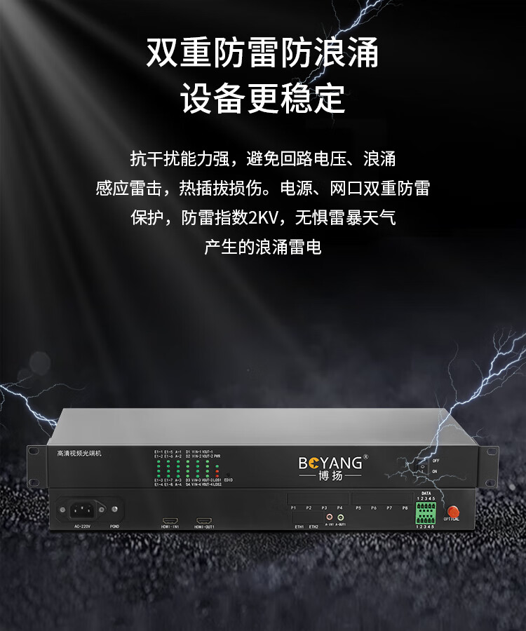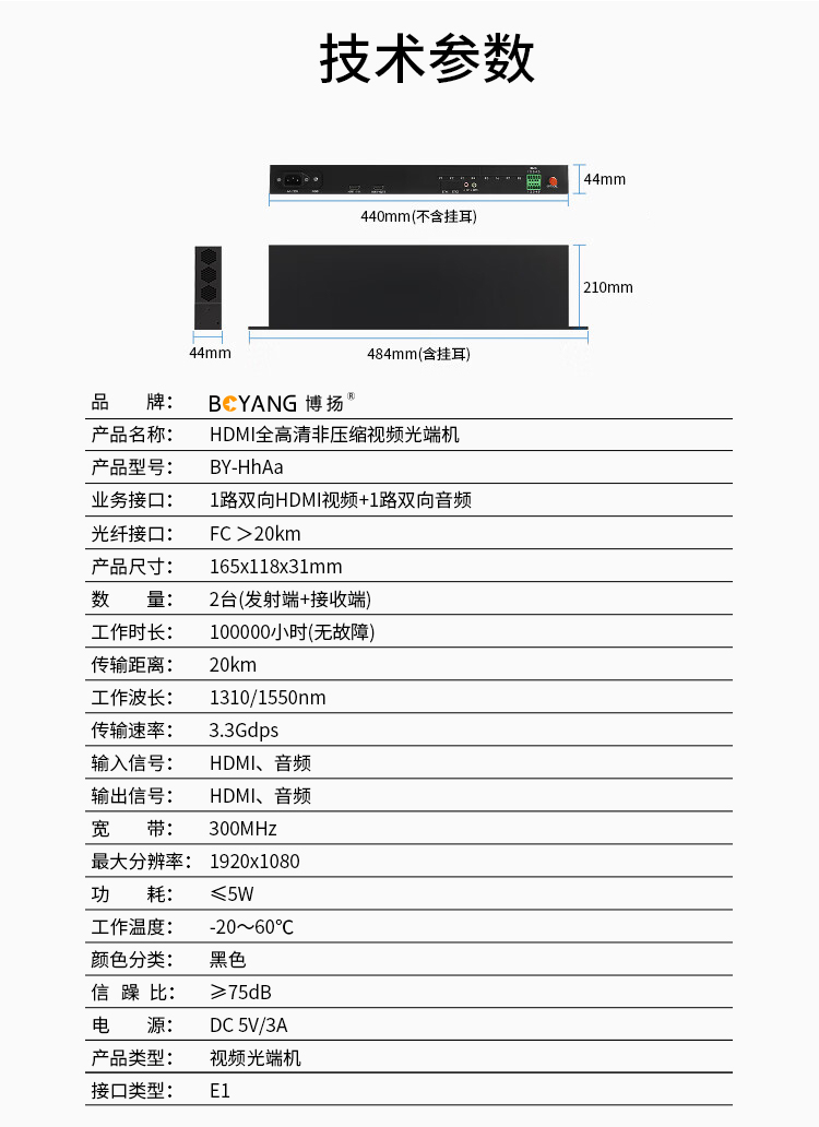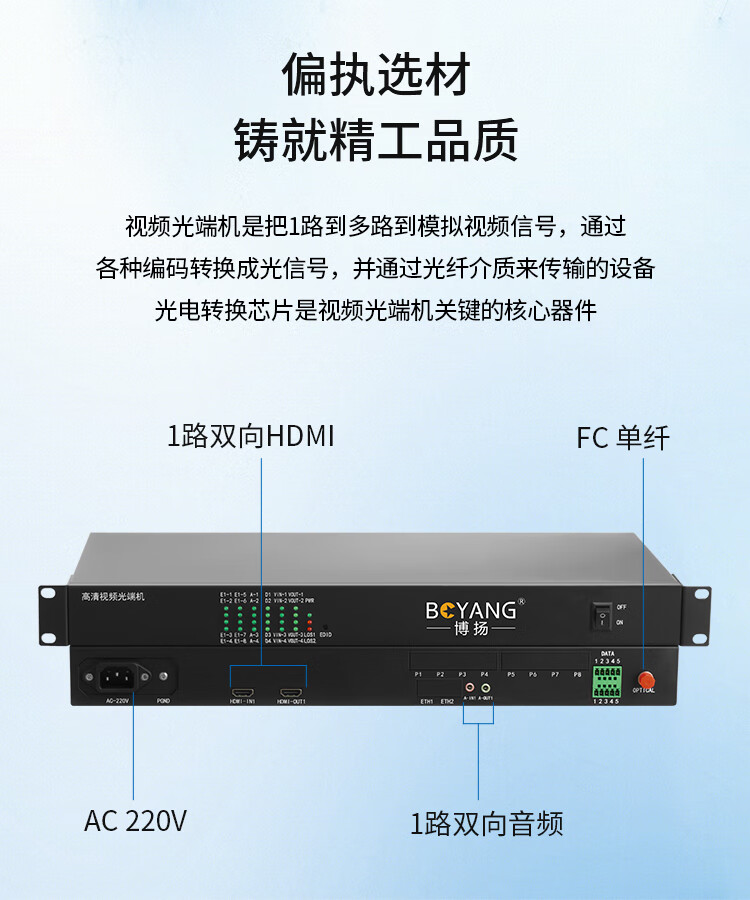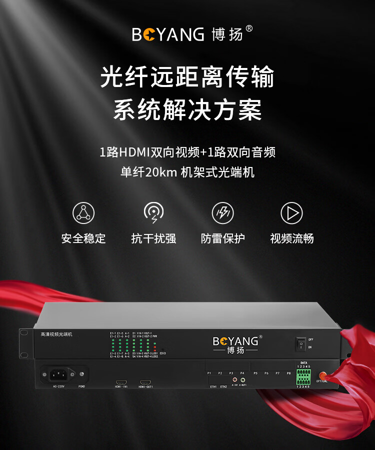 博扬 非压缩1路双向HDMI视频光端机+1路双向音频 单纤20公里 视频光纤延长器 机架式 1对价 黑色