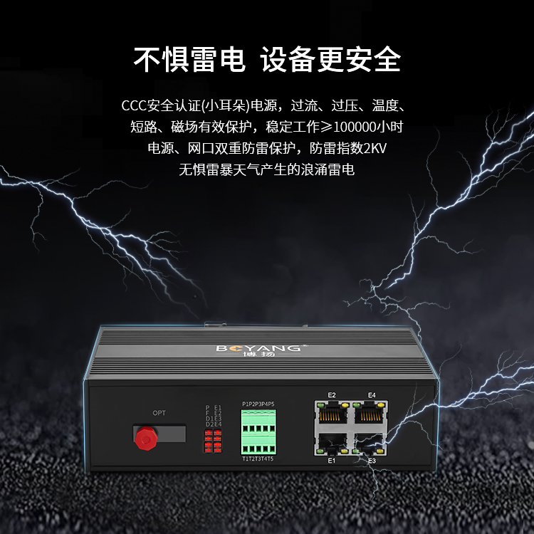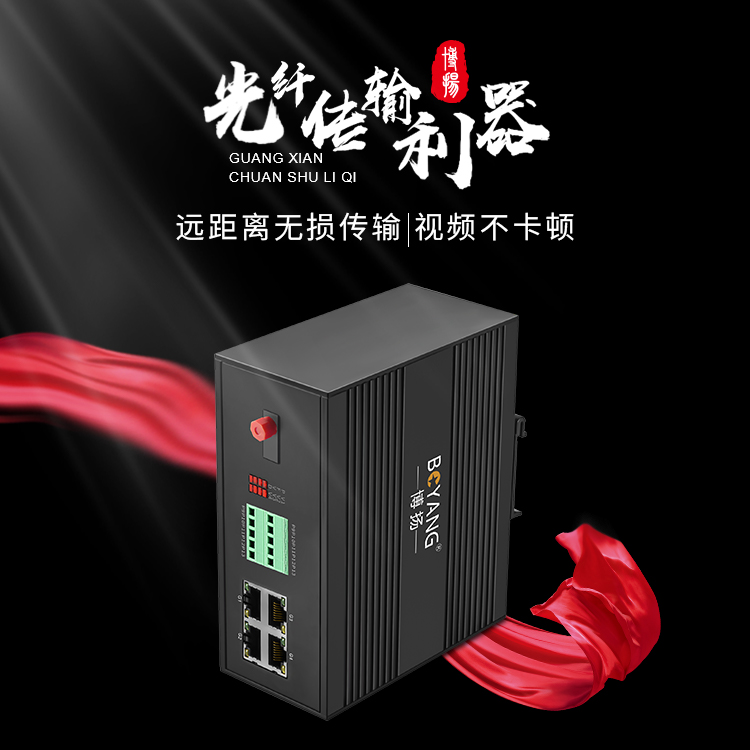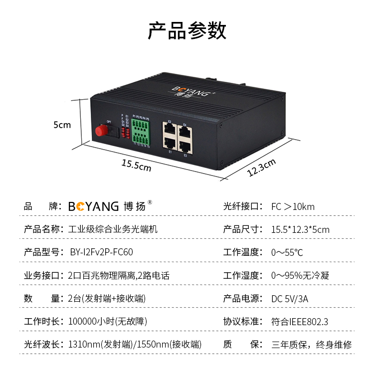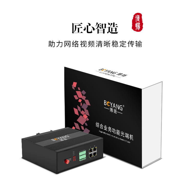 博扬 工业级综合业务光端机 2路百兆物理隔离+2路电话 单纤FC 60km 一对价 黑色