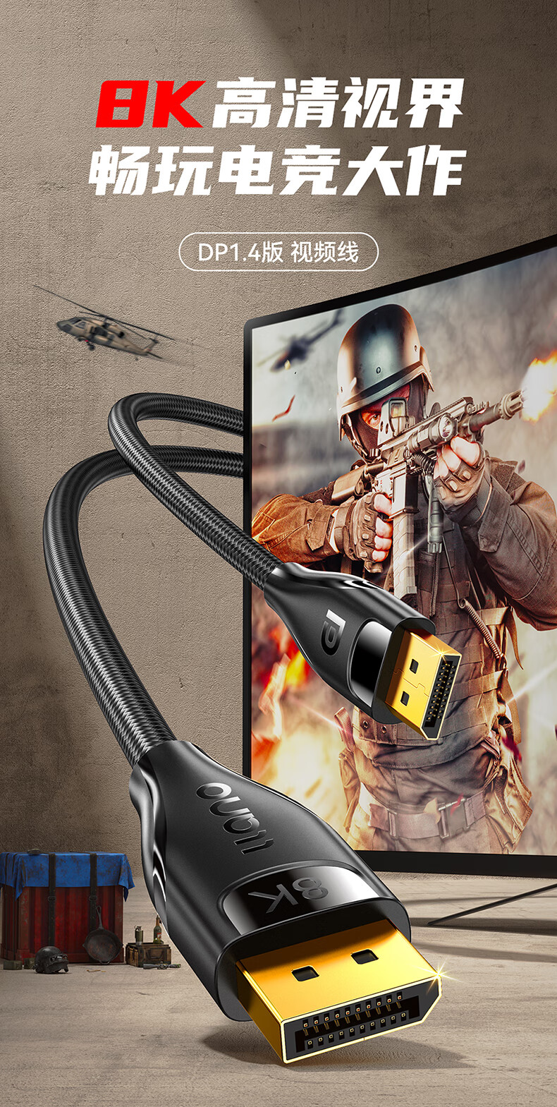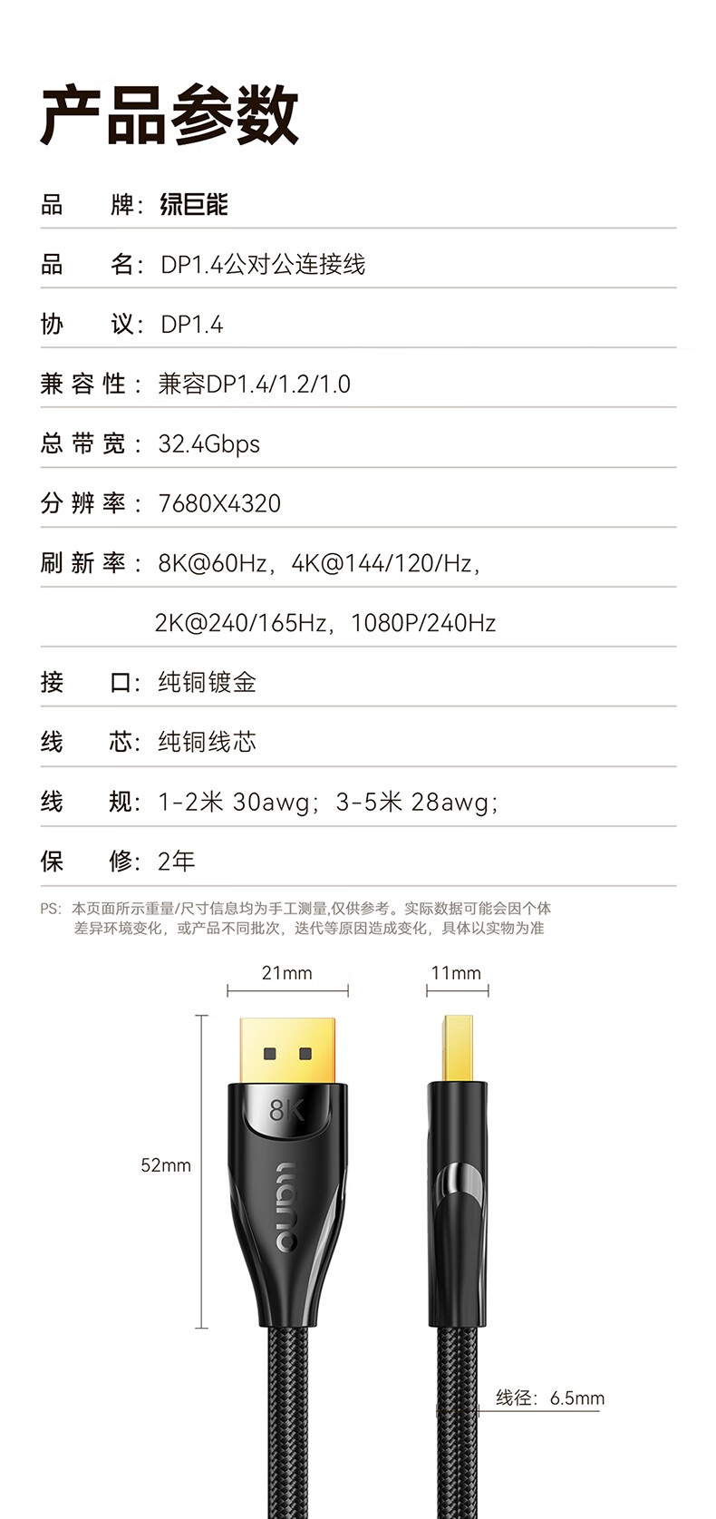 绿巨能 DP线1.4版 8K高清4K144Hz 2K165Hz DisplayPort公对公3米 黑色