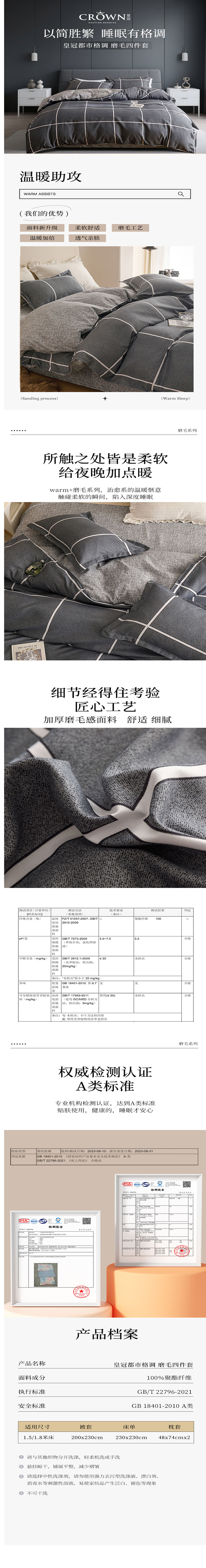 皇冠(CROWN) 都市格调磨毛四件套 T3513 200*230CM 蓝灰色(单位:套)